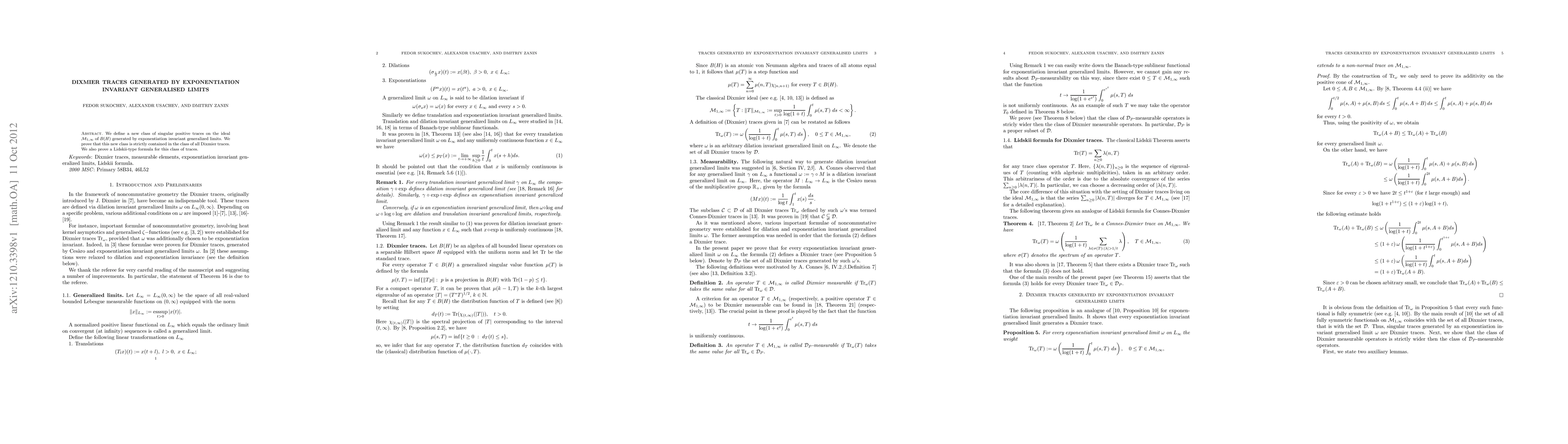 We define a new class of singular positive traces on the ideal $\mathcal M_{1,\infty}$ of $B(H)$ generated by exponentiation invariant generalized limits. We prove that this new class is strictly contained in the class of all Dixmier traces. We also prove a Lidskii-type formula for this class of traces.