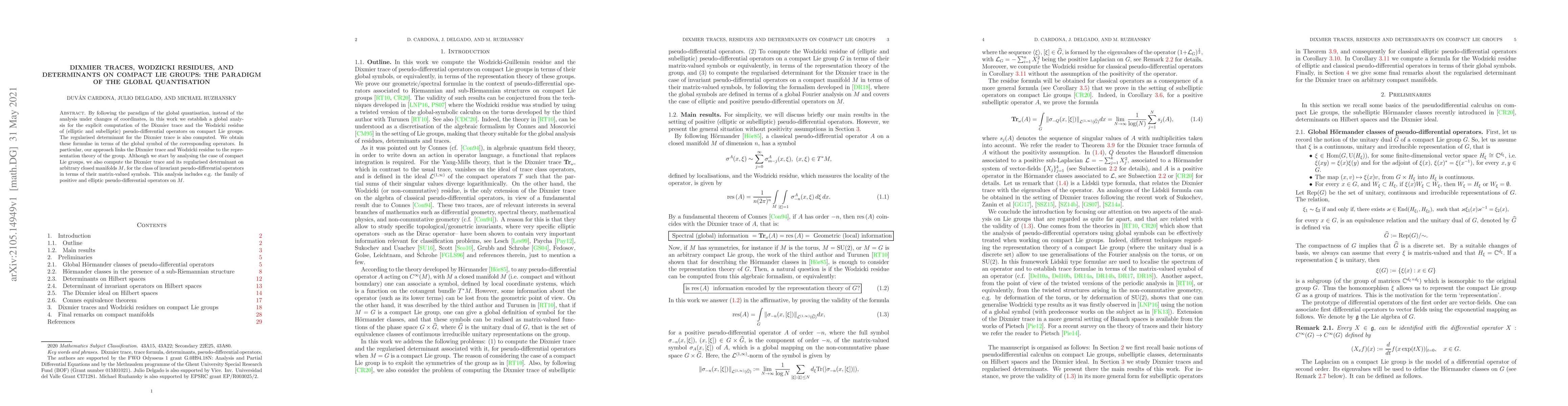 \begin{abstract} By following the paradigm of the global quantisation, instead of the analysis under changes of coordinates, in this work we establish a global analysis for the explicit computation of the Dixmier trace and the Wodzicki residue of (elliptic and subelliptic) pseudo-differential operators on compact Lie groups. The regularised determinant for the Dixmier trace is also computed. We obtain these formulae in terms of the global symbol of the corresponding operators. In particular, our approach links the Dixmier trace and Wodzicki residue to the representation theory of the group. Although we start by analysing the case of compact Lie groups, we also compute the Dixmier trace and its regularised determinant on arbitrary closed manifolds $M$, for the class of invariant pseudo-differential operators in terms of their matrix-valued symbols. This analysis includes e.g. the family of positive and elliptic pseudo-differential operators on $M$.