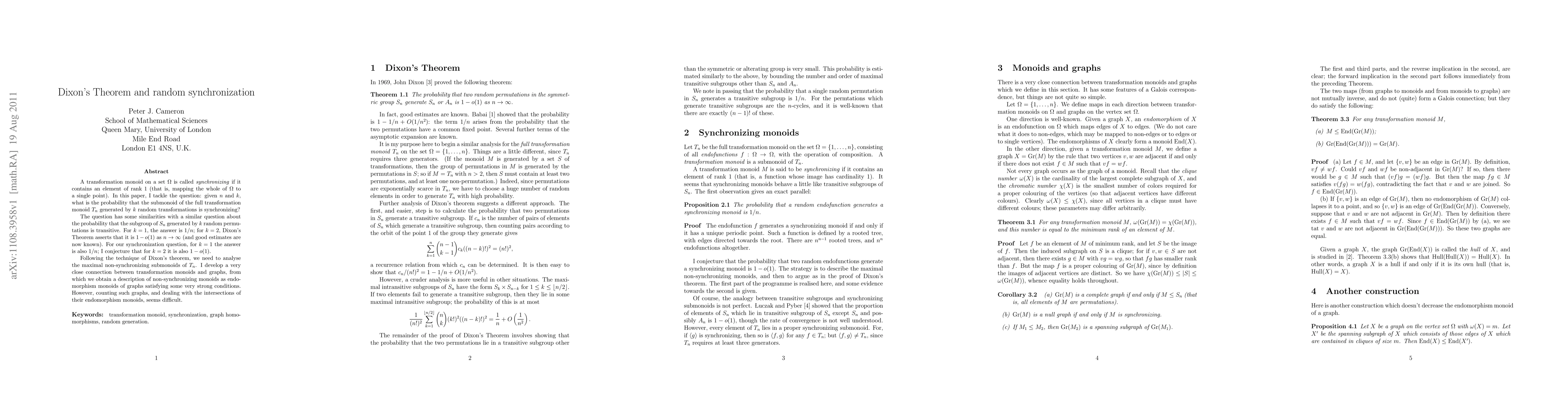 A transformation monoid on a set Omega is called synchronizing if it contains an element of rank 1 (that is, mapping the whole of Omega to a single point). In this paper, I tackle the question: given n and k, what is the probability that the submonoid of the full transformation monoid T_n generated by k random transformations is synchronizing? This question is analogous to Dixon's Theorem that two random permutations generate the symmetric or alternating group with high probability. Following the technique of Dixon's theorem, we need to analyse the maximal non-synchronizing submonoids of T_n. I develop a very close connection between transformation monoids and graphs, from which we obtain a description of non-synchronizing monoids as endomorphism monoids of graphs satisfying some very strong conditions. However, counting such graphs, and dealing with the intersections of their endomorphism monoids, seems difficult.