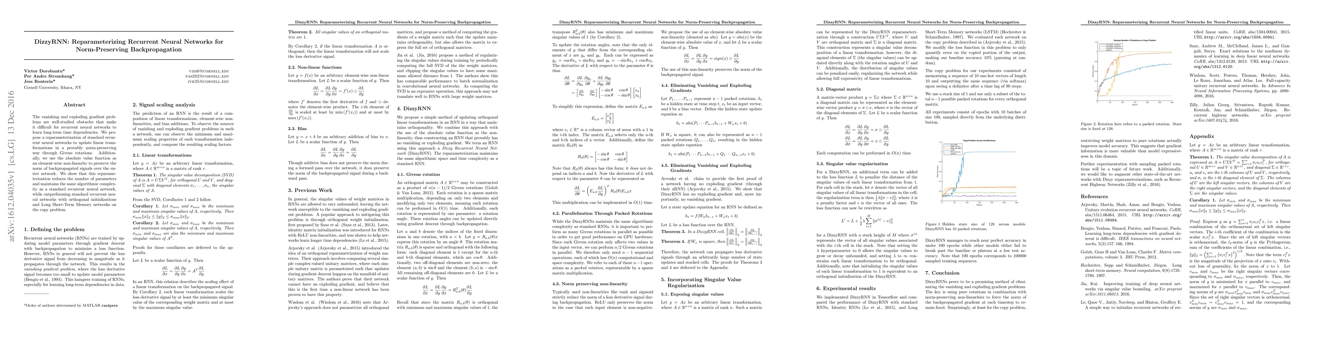 DizzyRNN proposes a reparameterization technique using Givens rotations and absolute value functions to address vanishing and exploding gradient issues in recurrent neural networks, ensuring norm-preserving backpropagation. This method reduces parameters while maintaining complexity and outperforms standard RNNs and LSTMs on the copy problem.
