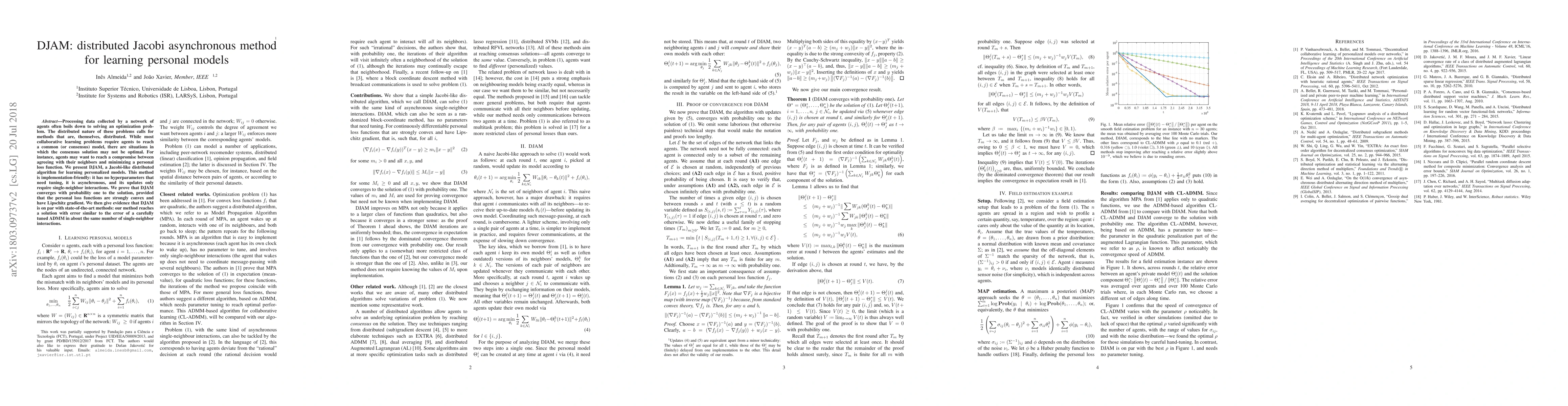 Processing data collected by a network of agents often boils down to solving an optimization problem. The distributed nature of these problems calls for methods that are, themselves, distributed. While most collaborative learning problems require agents to reach a common (or consensus) model, there are situations in which the consensus solution may not be optimal. For instance, agents may want to reach a compromise between agreeing with their neighbors and minimizing a personal loss function. We present DJAM, a Jacobi-like distributed algorithm for learning personalized models. This method is implementation-friendly: it has no hyperparameters that need tuning, it is asynchronous, and its updates only require single-neighbor interactions. We prove that DJAM converges with probability one to the solution, provided that the personal loss functions are strongly convex and have Lipschitz gradient. We then give evidence that DJAM is on par with state-of-the-art methods: our method reaches a solution with error similar to the error of a carefully tuned ADMM in about the same number of single-neighbor interactions.
