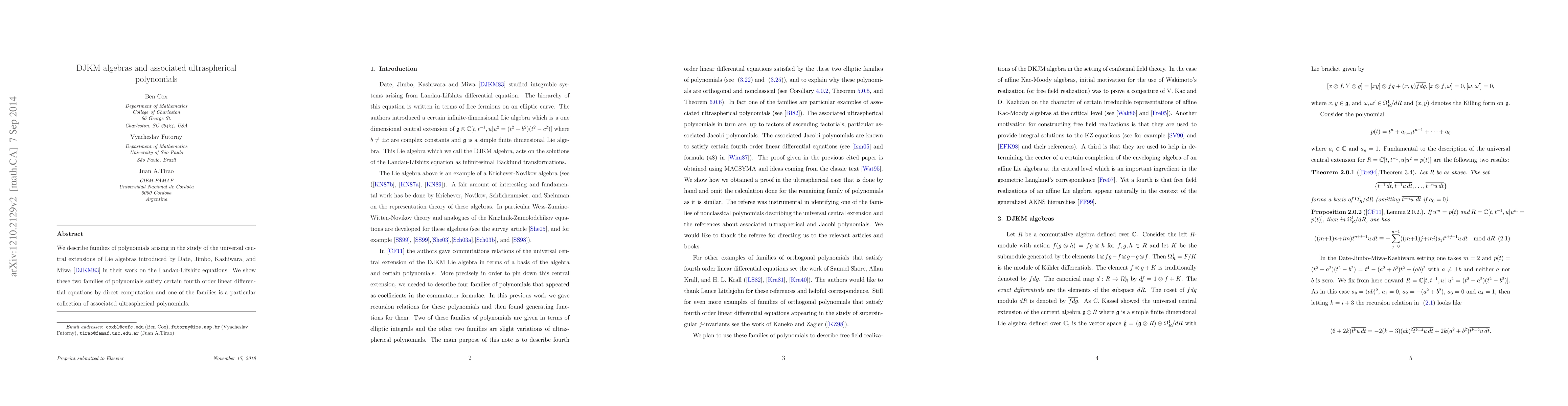 We describe families of polynomials arising in the study of the universal central extensions of Lie algebras introduced by Date, Jimbo, Kashiwara, and Miwa in their work on the Landau-Lifshitz equations. Two of the families of polynomials we show satisfy certain forth order linear differential equations, are orthogonal and are not of classical type.