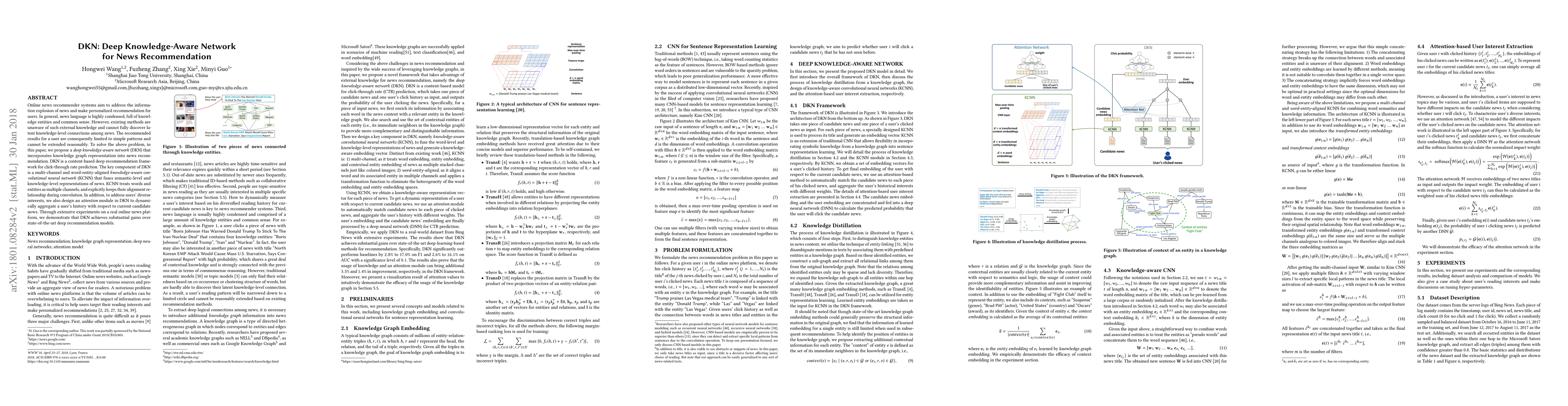 Online news recommender systems aim to address the information explosion of news and make personalized recommendation for users. In general, news language is highly condensed, full of knowledge entities and common sense. However, existing methods are unaware of such external knowledge and cannot fully discover latent knowledge-level connections among news. The recommended results for a user are consequently limited to simple patterns and cannot be extended reasonably. Moreover, news recommendation also faces the challenges of high time-sensitivity of news and dynamic diversity of users' interests. To solve the above problems, in this paper, we propose a deep knowledge-aware network (DKN) that incorporates knowledge graph representation into news recommendation. DKN is a content-based deep recommendation framework for click-through rate prediction. The key component of DKN is a multi-channel and word-entity-aligned knowledge-aware convolutional neural network (KCNN) that fuses semantic-level and knowledge-level representations of news. KCNN treats words and entities as multiple channels, and explicitly keeps their alignment relationship during convolution. In addition, to address users' diverse interests, we also design an attention module in DKN to dynamically aggregate a user's history with respect to current candidate news. Through extensive experiments on a real online news platform, we demonstrate that DKN achieves substantial gains over state-of-the-art deep recommendation models. We also validate the efficacy of the usage of knowledge in DKN.