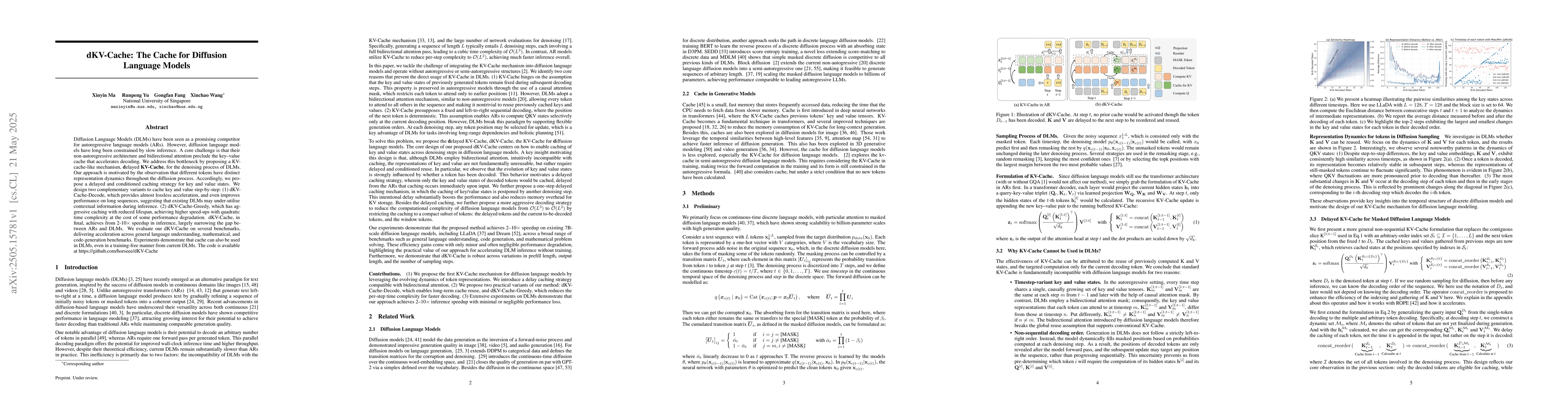 This paper proposes a caching mechanism for diffusion language models, achieving 2-10x speedup in inference, and narrowing the gap between ARs and DLMs.