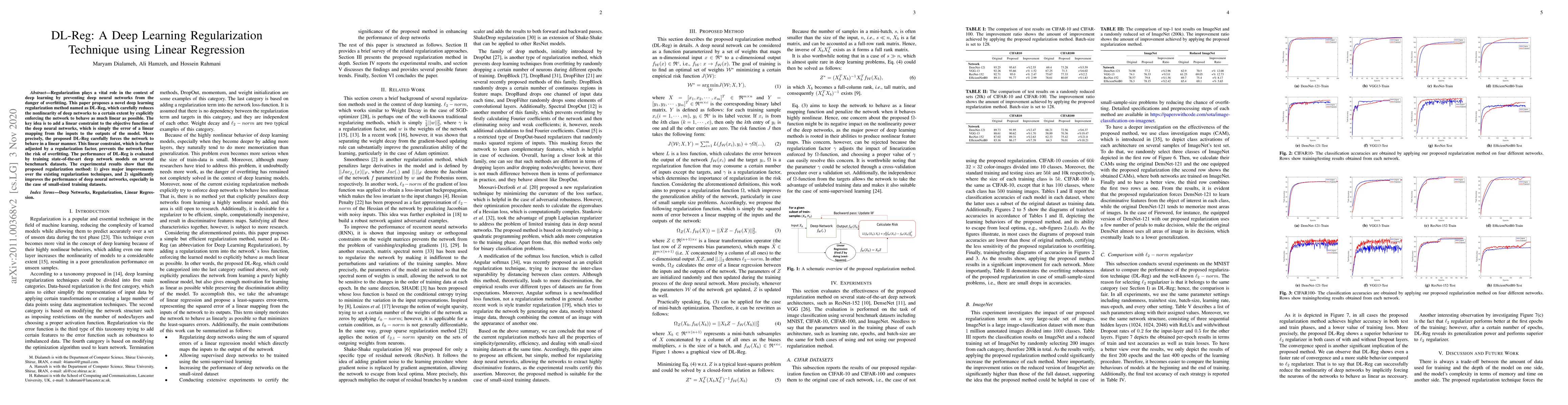 The paper proposes DL-Reg, a deep learning regularization technique that enforces linear behavior in deep neural networks by adding a linear constraint to the objective function, which is the error of a linear mapping from inputs to outputs.