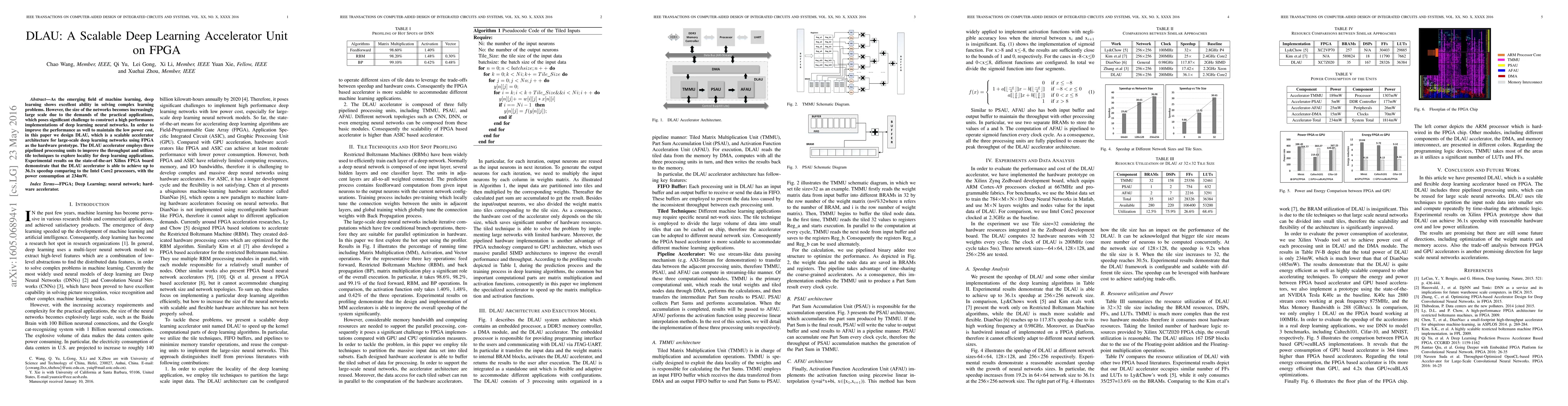 The paper introduces DLAU, a scalable FPGA-based deep learning accelerator designed to handle large-scale neural networks efficiently. The DLAU architecture employs three pipelined processing units and tile techniques to enhance throughput and locality, achieving up to 36.1x speedup compared to Intel Core2 processors while maintaining low power consumption at 234mW.