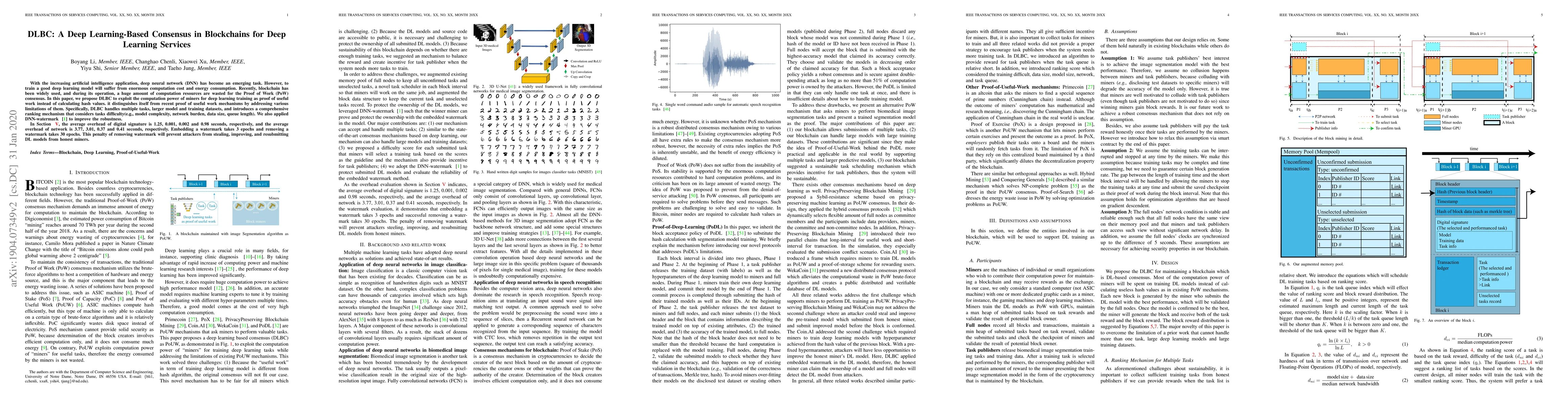With the increasing artificial intelligence application, deep neural network (DNN) has become an emerging task. However, to train a good deep learning model will suffer from enormous computation cost and energy consumption. Recently, blockchain has been widely used, and during its operation, a huge amount of computation resources are wasted for the Proof of Work (PoW) consensus. In this paper, we propose DLBC to exploit the computation power of miners for deep learning training as proof of useful work instead of calculating hash values. it distinguishes itself from recent proof of useful work mechanisms by addressing various limitations of them. Specifically, DLBC handles multiple tasks, larger model and training datasets, and introduces a comprehensive ranking mechanism that considers tasks difficulty(e.g., model complexity, network burden, data size, queue length). We also applied DNN-watermark [1] to improve the robustness. In Section V, the average overhead of digital signature is 1.25, 0.001, 0.002 and 0.98 seconds, respectively, and the average overhead of network is 3.77, 3.01, 0.37 and 0.41 seconds, respectively. Embedding a watermark takes 3 epochs and removing a watermark takes 30 epochs. This penalty of removing watermark will prevent attackers from stealing, improving, and resubmitting DL models from honest miners.
