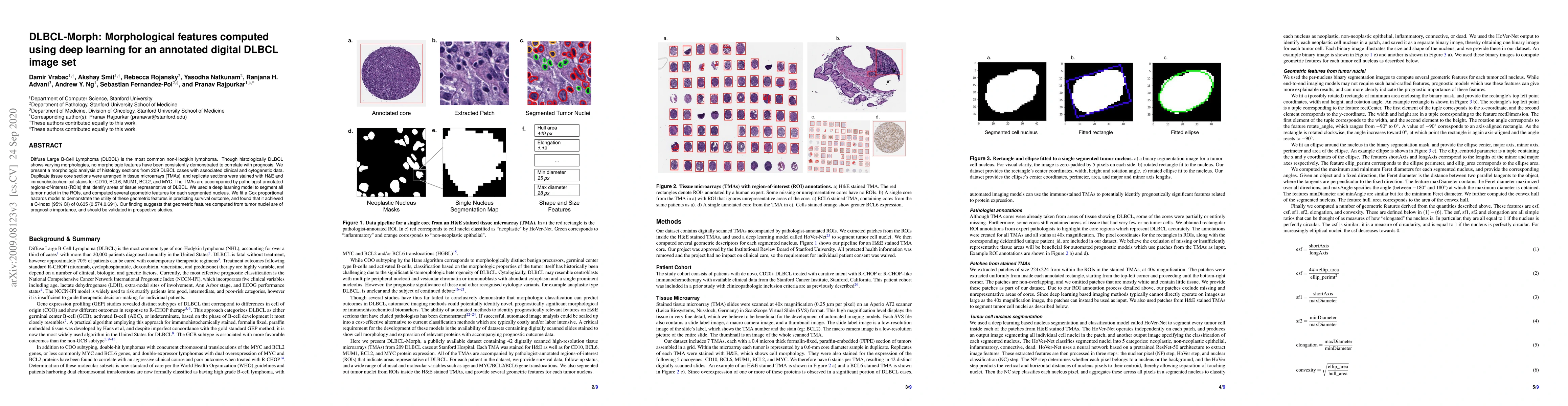 Diffuse Large B-Cell Lymphoma (DLBCL) is the most common non-Hodgkin lymphoma. Though histologically DLBCL shows varying morphologies, no morphologic features have been consistently demonstrated to correlate with prognosis. We present a morphologic analysis of histology sections from 209 DLBCL cases with associated clinical and cytogenetic data. Duplicate tissue core sections were arranged in tissue microarrays (TMAs), and replicate sections were stained with H&E and immunohistochemical stains for CD10, BCL6, MUM1, BCL2, and MYC. The TMAs are accompanied by pathologist-annotated regions-of-interest (ROIs) that identify areas of tissue representative of DLBCL. We used a deep learning model to segment all tumor nuclei in the ROIs, and computed several geometric features for each segmented nucleus. We fit a Cox proportional hazards model to demonstrate the utility of these geometric features in predicting survival outcome, and found that it achieved a C-index (95% CI) of 0.635 (0.574,0.691). Our finding suggests that geometric features computed from tumor nuclei are of prognostic importance, and should be validated in prospective studies.