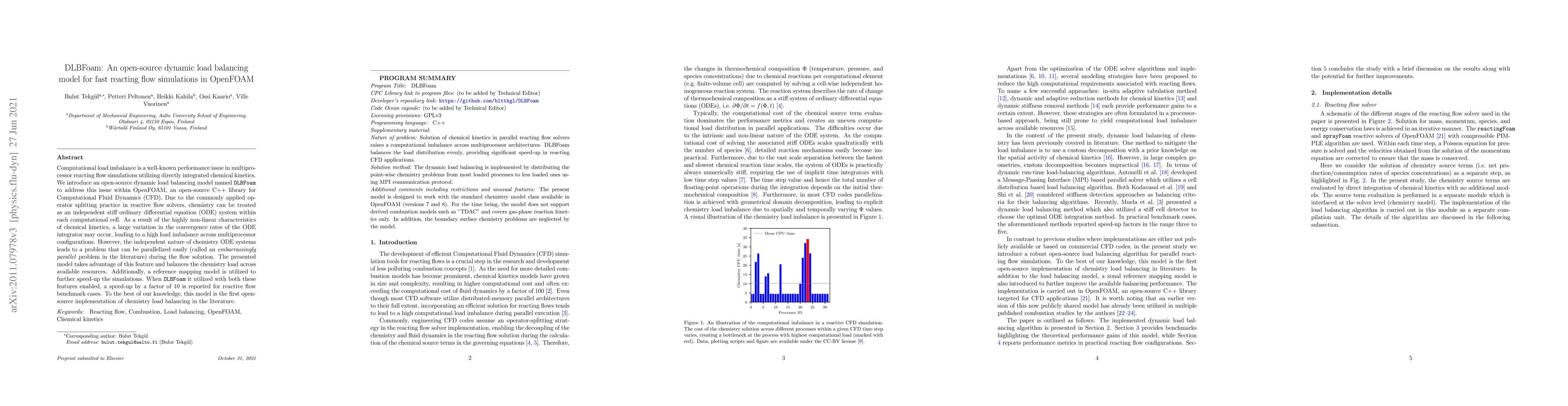 The paper introduces DLBFoam, an open-source dynamic load balancing model for addressing computational load imbalance in multiprocessor reacting flow simulations in OpenFOAM. It leverages the independent nature of chemistry ODE systems to balance load and reports a speed-up by a factor of 10 for reactive flow simulations.