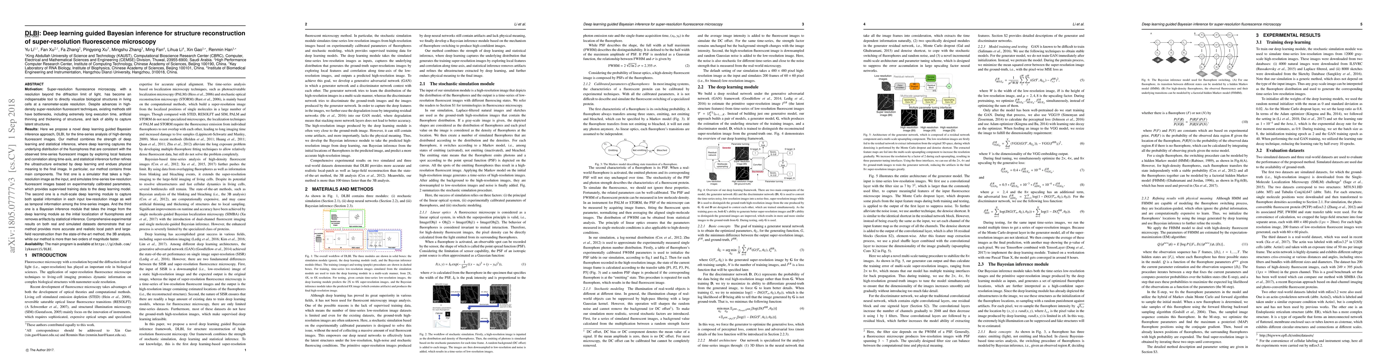 The paper proposes DLBI, a deep learning guided Bayesian inference method for reconstructing super-resolution fluorescence microscopy images, combining deep learning for feature extraction and Bayesian inference for refined ultrastructure reconstruction. Experimental results show DLBI is significantly faster and more accurate than existing methods.