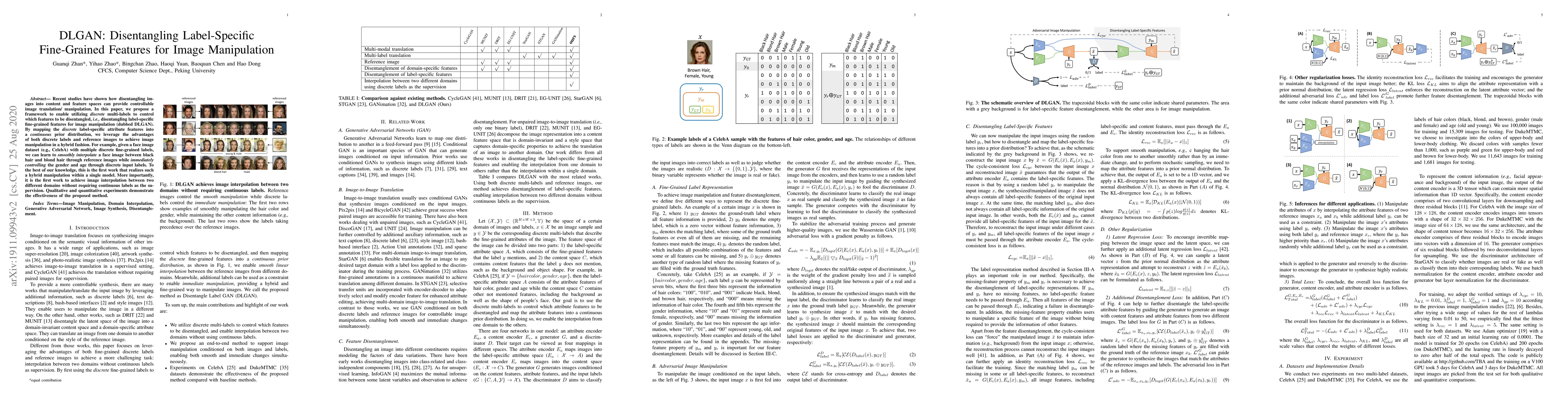 The paper proposes DLGAN, a framework for disentangling label-specific fine-grained features to control image manipulation, enabling hybrid image translation using discrete multi-labels and reference images. The method achieves domain-specific interpolation without continuous label supervision, demonstrated through effective qualitative and quantitative experiments.