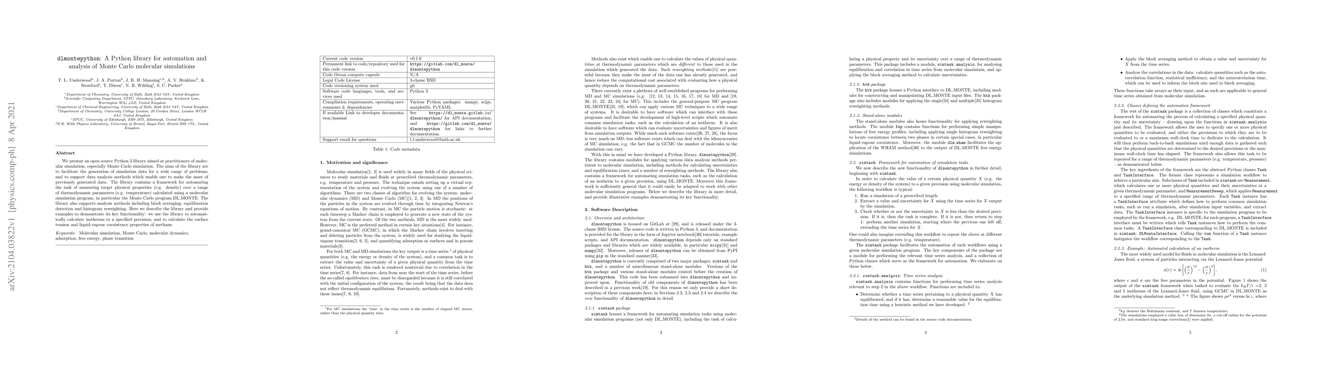 The dlmontepython library is an open-source Python tool designed for automating and analyzing Monte Carlo molecular simulations, facilitating data generation and analysis, and supporting methods like block averaging and histogram reweighting. It demonstrates its utility by calculating isotherms and liquid-vapour properties of methane.