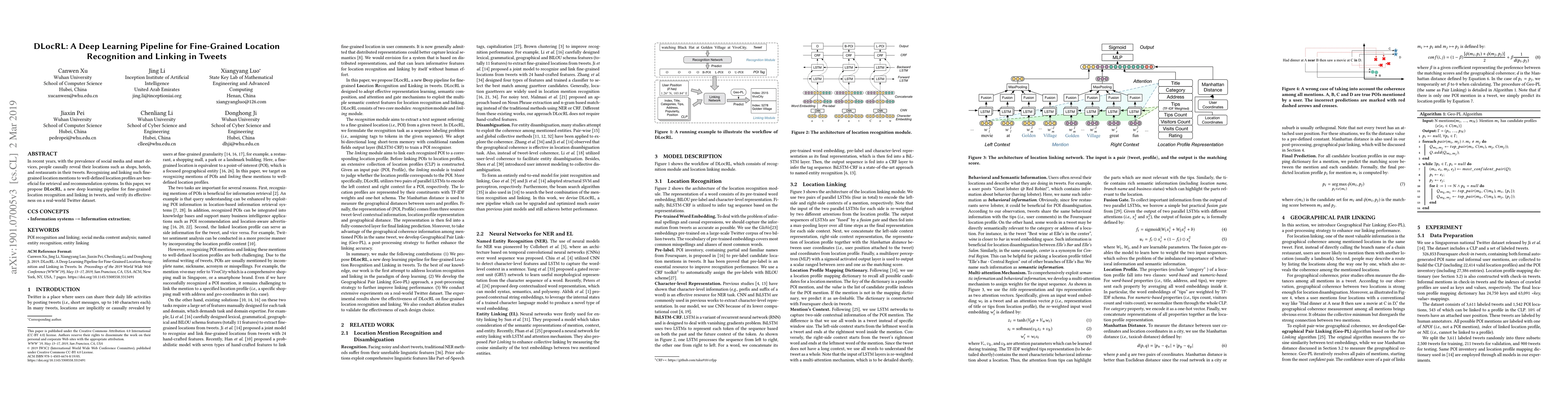 DLocRL is a novel deep learning pipeline designed to recognize and link fine-grained location mentions in tweets to well-defined location profiles, enhancing retrieval and recommendation systems. The effectiveness of DLocRL is validated using a real-world Twitter dataset.