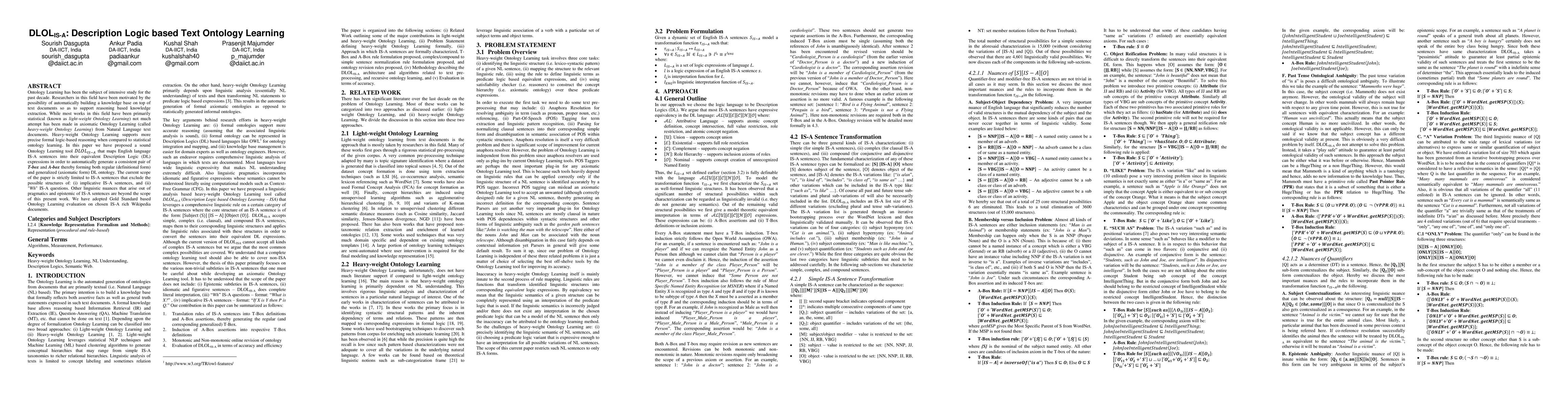 This paper proposes DLOLIS-A, a tool for heavy-weight Ontology Learning that converts English IS-A sentences into Description Logic expressions to generate precise formal ontologies. The tool focuses on IS-A sentences, excluding complex structures and pragmatic nuances, and is evaluated using Gold Standard methods on Wikipedia documents.