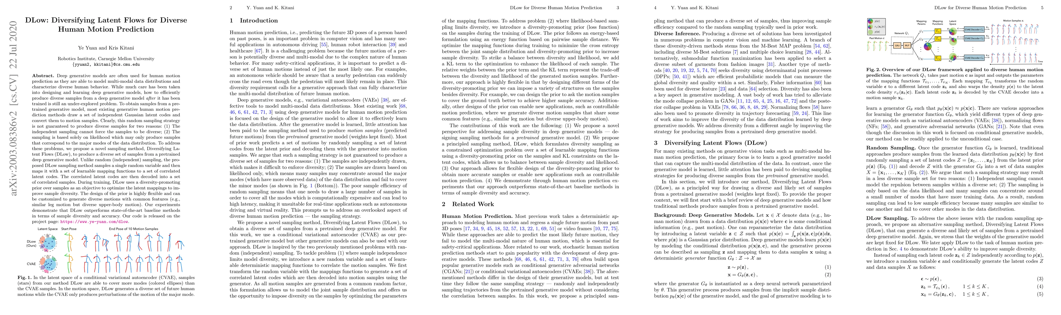 The paper proposes DLow, a novel sampling method to generate diverse human motion samples from pretrained deep generative models, addressing the limitations of random sampling by using correlated latent codes and a diversity-promoting prior during training. DLow outperforms existing methods in producing diverse and accurate motion predictions.