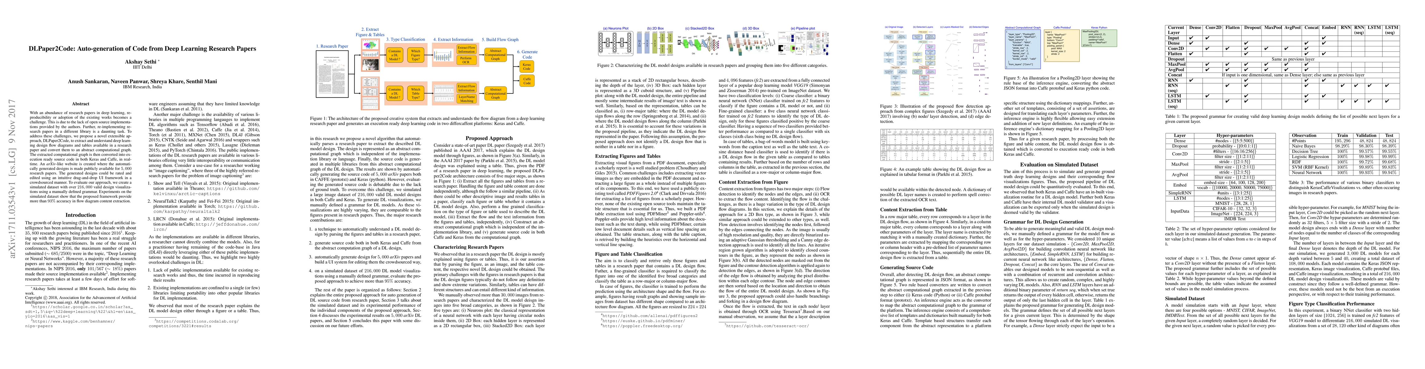 DLPaper2Code automates the generation of code from deep learning research papers by converting design diagrams and tables into computational graphs and execution-ready source code in Keras and Caffe. The approach aims to enhance reproducibility and adoption, with generated designs publicly available and editable via a crowdsourced UI.