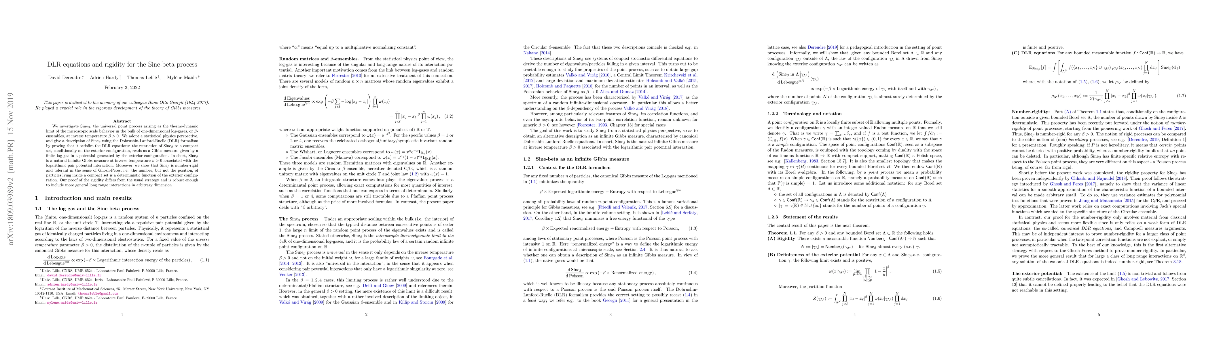 We investigate Sine$_\beta$, the universal point process arising as the thermodynamic limit of the microscopic scale behavior in the bulk of one-dimensional log-gases, or $\beta$-ensembles, at inverse temperature $\beta>0$. We adopt a statistical physics perspective, and give a description of Sine$_\beta$ using the Dobrushin-Lanford-Ruelle (DLR) formalism by proving that it satisfies the DLR equations: the restriction of Sine$_\beta$ to a compact set, conditionally to the exterior configuration, reads as a Gibbs measure given by a finite log-gas in a potential generated by the exterior configuration. Moreover, we show that Sine$_\beta$ is number-rigid and tolerant in the sense of Ghosh-Peres, i.e. the number, but not the position, of particles lying inside a compact set is a deterministic function of the exterior configuration. Our proof of the rigidity differs from the usual strategy and is robust enough to include more general long range interactions in arbitrary dimension.