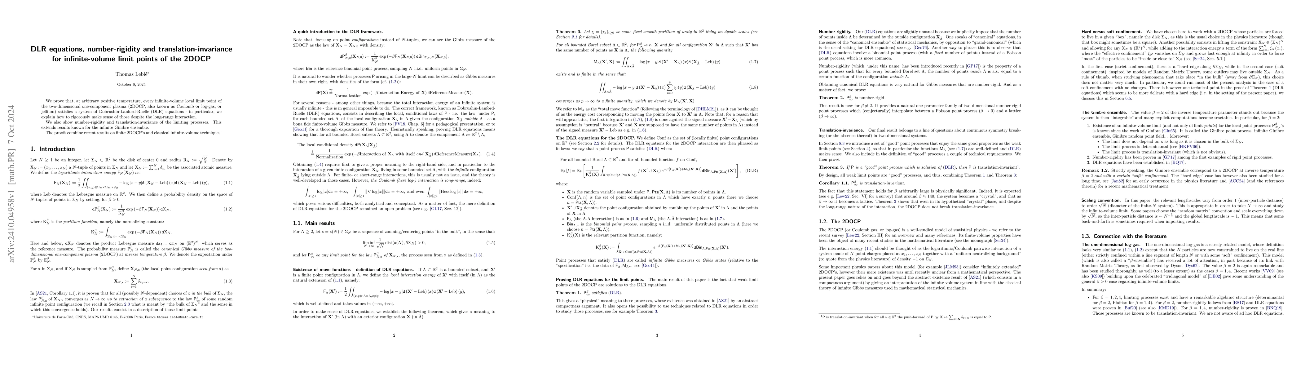Summary: The research demonstrates that infinite-volume limit points of the 2DOCP satisfy Dobrushin-Lanford-Ruelle equations at any positive temperature, alongside proving number-rigidity and translation-invariance, extending previous results from the infinite Ginibre ensemble through a blend of finite 2DOCP findings and infinite-volume methods.
