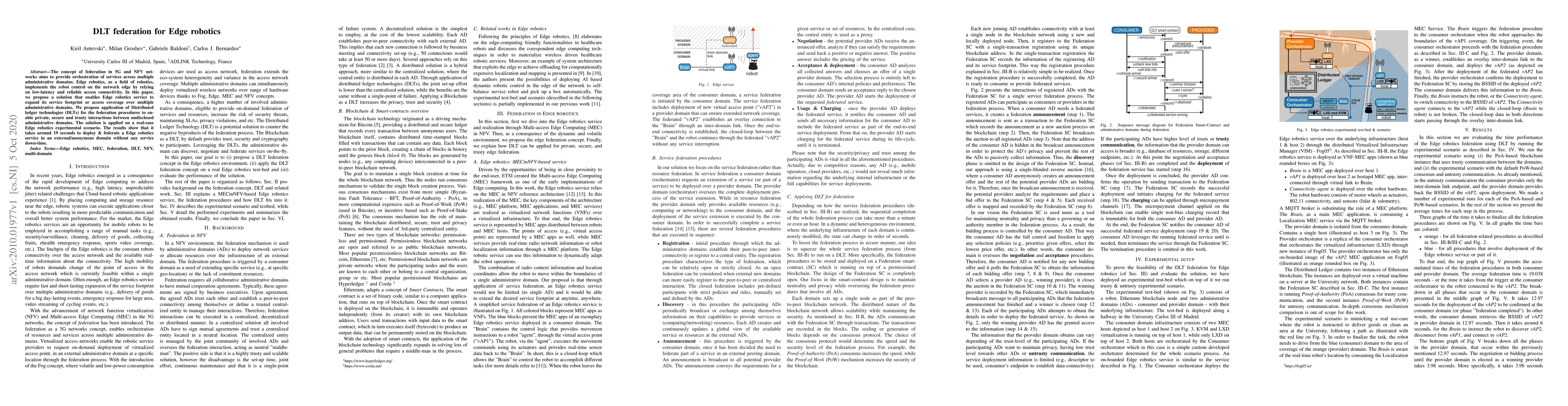 This paper proposes a DLT-based federation solution for expanding Edge robotics service across multiple administrative domains, ensuring secure and reliable interactions. Experimental results demonstrate a 19-second deployment time for federating services without downtime.