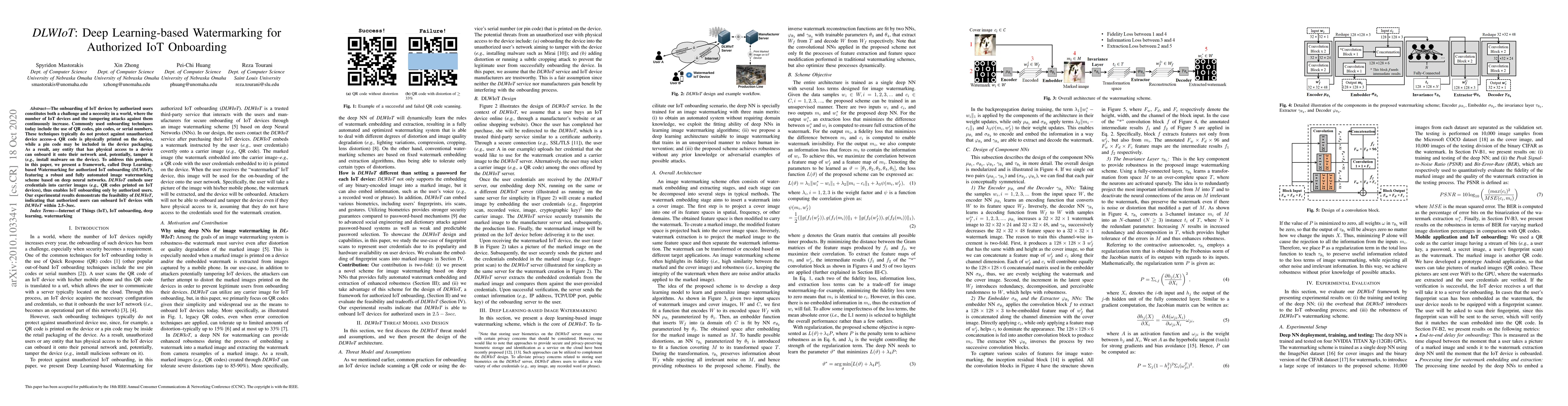 The paper introduces DLWIoT, a deep learning-based framework for authorized IoT onboarding using image watermarking, which embeds user credentials into QR codes to prevent unauthorized access and tampering. Experimental results show that DLWIoT enables authorized onboarding in 2.5-3 seconds.