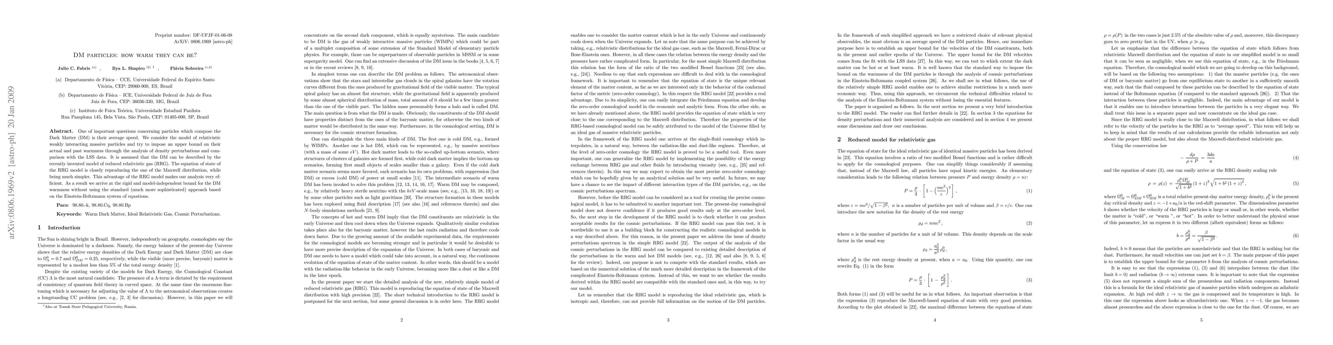 This paper investigates the average speed of relativistic weakly interacting massive particles (DM) composing Dark Matter, aiming to establish an upper bound on their "warmness" through density perturbations and Large Scale Structure (LSS) data analysis. Utilizing the simplified reduced relativistic gas (RRG) model, the study achieves a model-independent bound for DM warmness without relying on the complex Einstein-Boltzmann system.