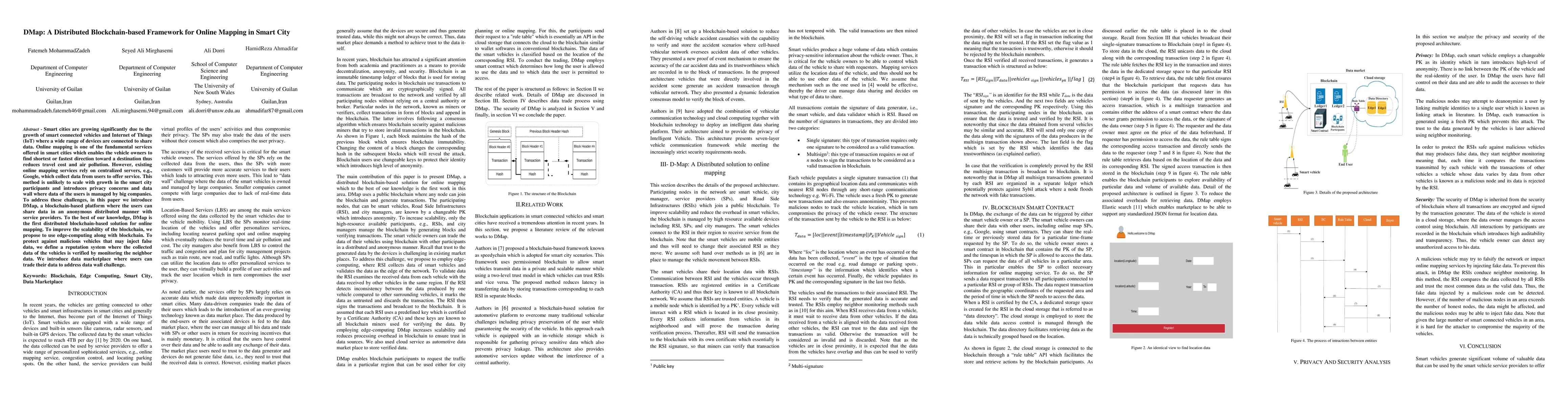 DMap is a blockchain-based framework for distributed online mapping in smart cities, addressing scalability, privacy, and data wall issues through edge computing and a reputation system. It also introduces a data marketplace to enable data trading among users.