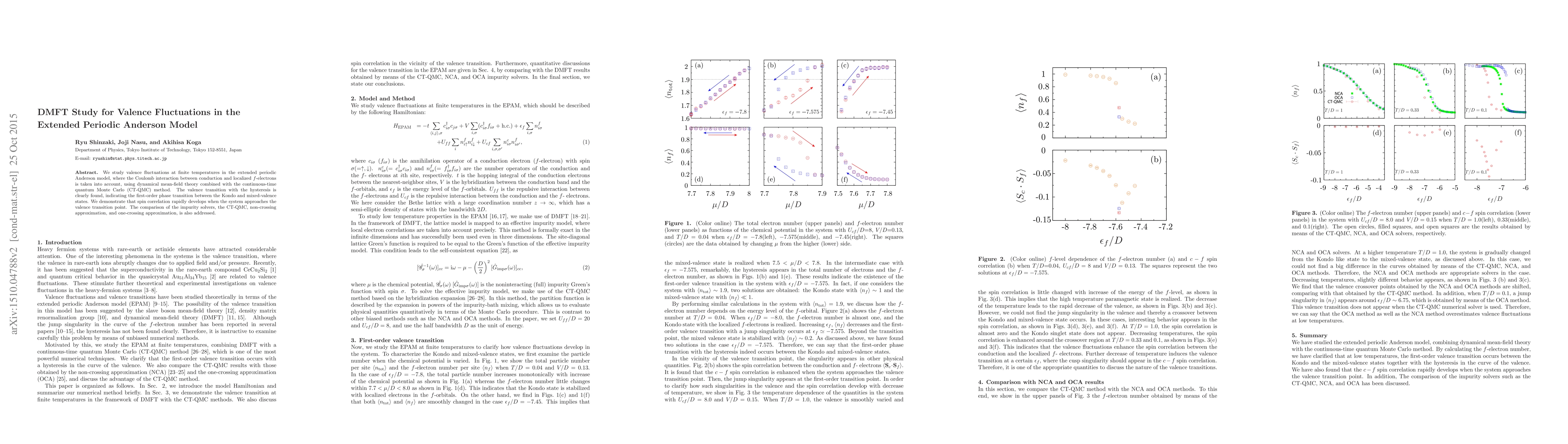 This study uses dynamical mean-field theory with continuous-time quantum Monte Carlo to investigate valence fluctuations in the extended periodic Anderson model, revealing a first-order phase transition and hysteresis between Kondo and mixed-valence states, with significant spin correlation near the transition. The research also compares different impurity solvers for their effectiveness.