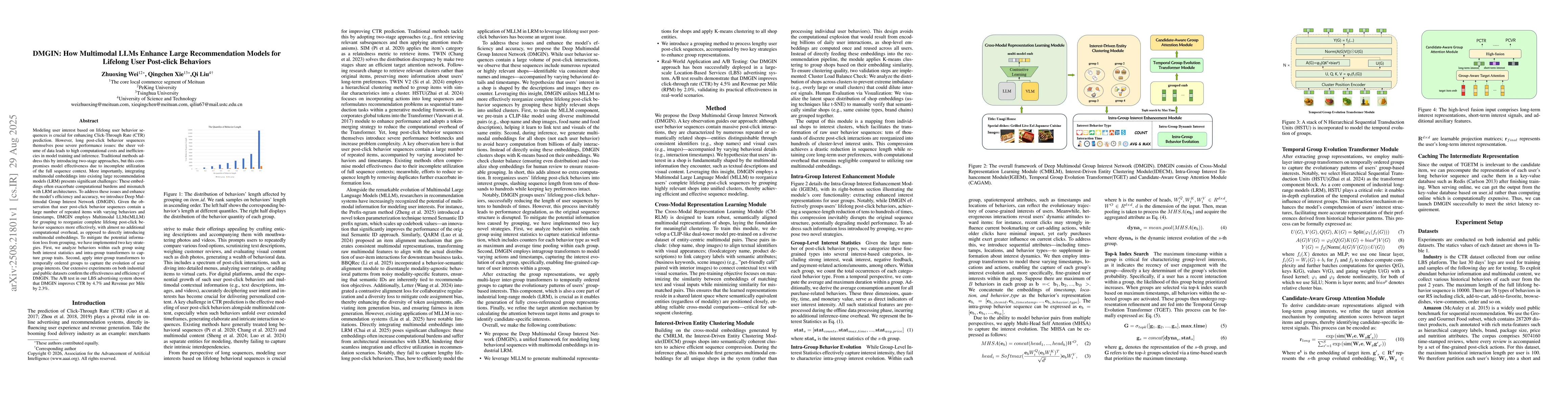 Modeling user interest based on lifelong user behavior sequences is crucial for enhancing Click-Through Rate (CTR) prediction. However, long post-click behavior sequences themselves pose severe performance issues: the sheer volume of data leads to high computational costs and inefficiencies in model training and inference. Traditional methods address this by introducing two-stage approaches, but this compromises model effectiveness due to incomplete utilization of the full sequence context. More importantly, integrating multimodal embeddings into existing large recommendation models (LRM) presents significant challenges: These embeddings often exacerbate computational burdens and mismatch with LRM architectures. To address these issues and enhance the model's efficiency and accuracy, we introduce Deep Multimodal Group Interest Network (DMGIN). Given the observation that user post-click behavior sequences contain a large number of repeated items with varying behaviors and timestamps, DMGIN employs Multimodal LLMs(MLLM) for grouping to reorganize complete lifelong post-click behavior sequences more effectively, with almost no additional computational overhead, as opposed to directly introducing multimodal embeddings. To mitigate the potential information loss from grouping, we have implemented two key strategies. First, we analyze behaviors within each group using both interest statistics and intra-group transformers to capture group traits. Second, apply inter-group transformers to temporally ordered groups to capture the evolution of user group interests. Our extensive experiments on both industrial and public datasets confirm the effectiveness and efficiency of DMGIN. The A/B test in our LBS advertising system shows that DMGIN improves CTR by 4.7% and Revenue per Mile by 2.3%.