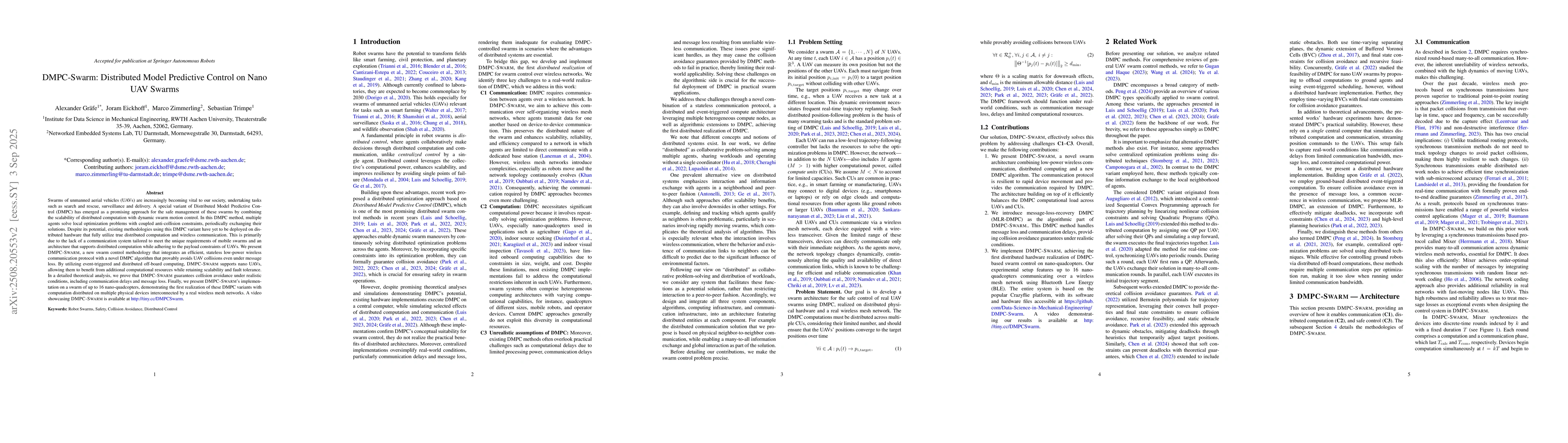 Swarms of unmanned aerial vehicles (UAVs) are increasingly becoming vital to our society, undertaking tasks such as search and rescue, surveillance and delivery. A special variant of Distributed Model Predictive Control (DMPC) has emerged as a promising approach for the safe management of these swarms by combining the scalability of distributed computation with dynamic swarm motion control. In this DMPC method, multiple agents solve local optimization problems with coupled anti-collision constraints, periodically exchanging their solutions. Despite its potential, existing methodologies using this DMPC variant have yet to be deployed on distributed hardware that fully utilize true distributed computation and wireless communication. This is primarily due to the lack of a communication system tailored to meet the unique requirements of mobile swarms and an architecture that supports distributed computation while adhering to the payload constraints of UAVs. We present DMPC-SWARM, a new swarm control methodology that integrates an efficient, stateless low-power wireless communication protocol with a novel DMPC algorithm that provably avoids UAV collisions even under message loss. By utilizing event-triggered and distributed off-board computing, DMPC-SWARM supports nano UAVs, allowing them to benefit from additional computational resources while retaining scalability and fault tolerance. In a detailed theoretical analysis, we prove that DMPC-SWARM guarantees collision avoidance under realistic conditions, including communication delays and message loss. Finally, we present DMPC-SWARM's implementation on a swarm of up to 16 nano-quadcopters, demonstrating the first realization of these DMPC variants with computation distributed on multiple physical devices interconnected by a real wireless mesh networks. A video showcasing DMPC-SWARM is available at http://tiny.cc/DMPCSwarm.