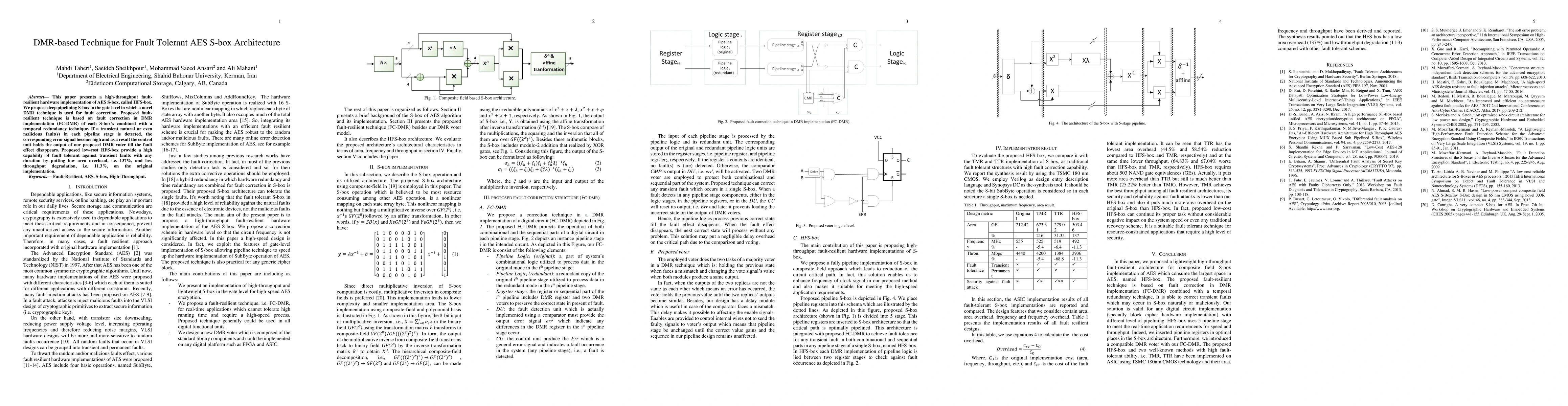 This paper introduces a high-throughput fault-tolerant AES S-box architecture called HFS-box, which uses a DMR voter to detect and mitigate transient faults, achieving low area overhead and minimal throughput degradation. The proposed design ensures high fault resilience with only a 137% area increase and 11.3% throughput reduction.