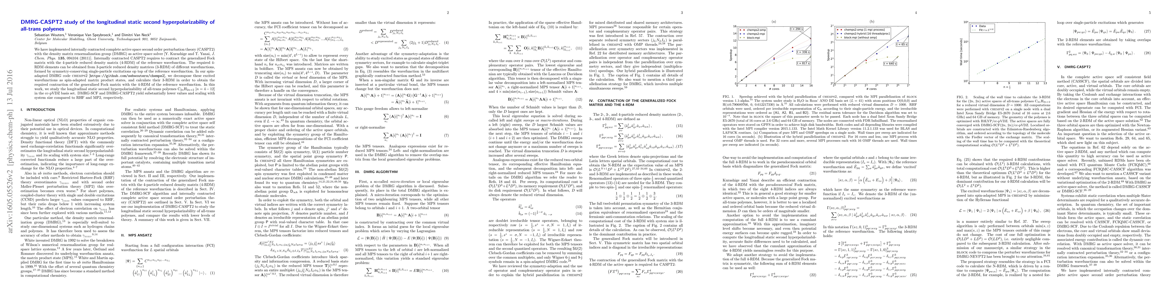 This study combines density matrix renormalization group (DMRG) with internally contracted complete active space second order perturbation theory (CASPT2) to investigate the longitudinal static second hyperpolarizability of all-trans polyenes. The results show that the DMRG-CASPT2 method provides more accurate and scalable calculations compared to traditional RHF and MP2 methods.
