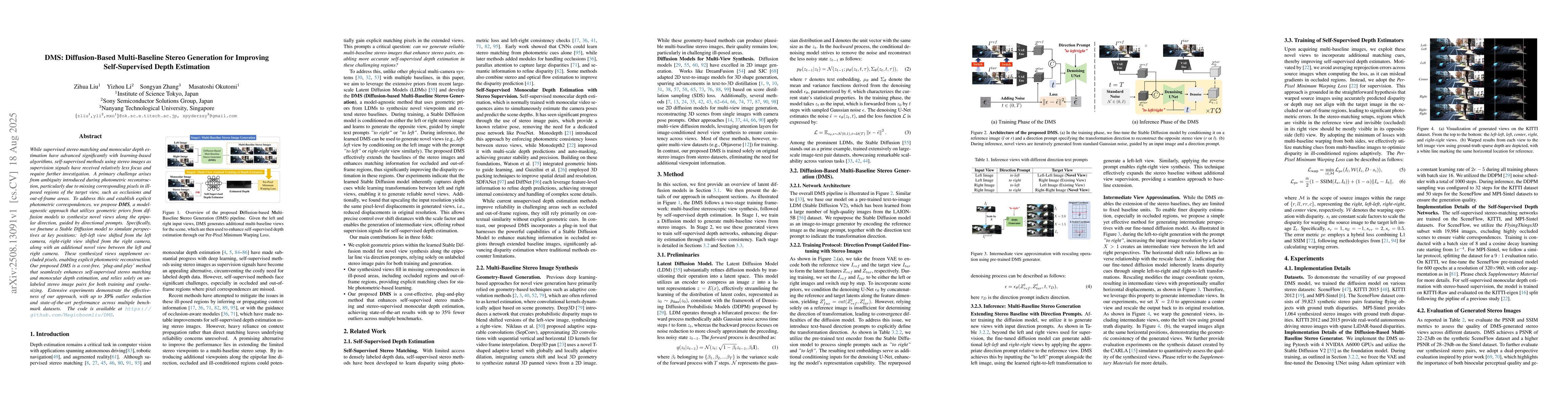 While supervised stereo matching and monocular depth estimation have advanced significantly with learning-based algorithms, self-supervised methods using stereo images as supervision signals have received relatively less focus and require further investigation. A primary challenge arises from ambiguity introduced during photometric reconstruction, particularly due to missing corresponding pixels in ill-posed regions of the target view, such as occlusions and out-of-frame areas. To address this and establish explicit photometric correspondences, we propose DMS, a model-agnostic approach that utilizes geometric priors from diffusion models to synthesize novel views along the epipolar direction, guided by directional prompts. Specifically, we finetune a Stable Diffusion model to simulate perspectives at key positions: left-left view shifted from the left camera, right-right view shifted from the right camera, along with an additional novel view between the left and right cameras. These synthesized views supplement occluded pixels, enabling explicit photometric reconstruction. Our proposed DMS is a cost-free, ''plug-and-play'' method that seamlessly enhances self-supervised stereo matching and monocular depth estimation, and relies solely on unlabeled stereo image pairs for both training and synthesizing. Extensive experiments demonstrate the effectiveness of our approach, with up to 35% outlier reduction and state-of-the-art performance across multiple benchmark datasets.