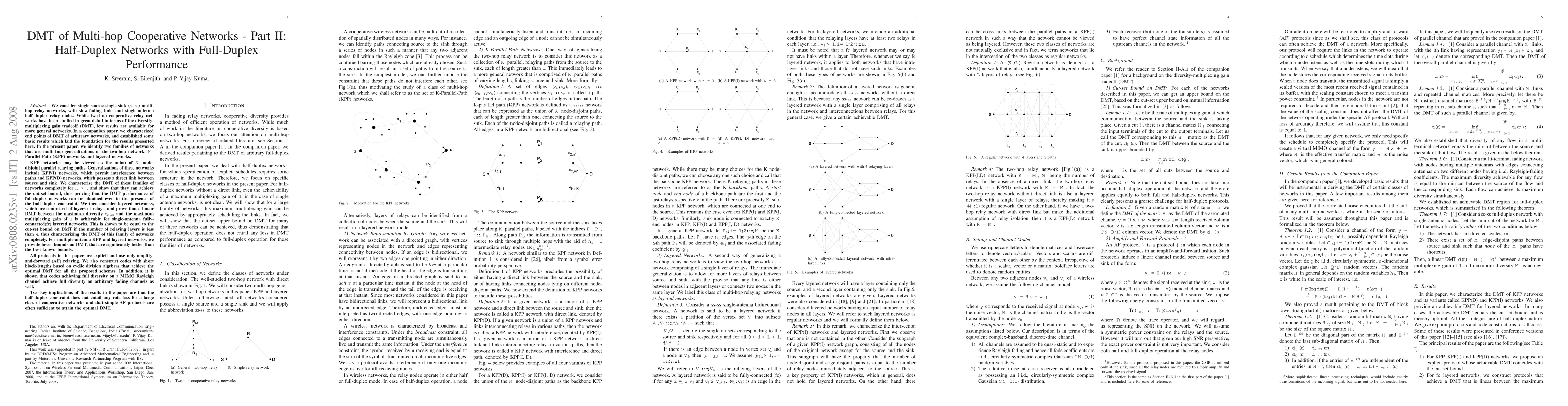 We consider single-source single-sink (ss-ss) multi-hop relay networks, with slow-fading links and single-antenna half-duplex relay nodes. In a companion paper, we established some basic results which laid the foundation for the results presented here. In the present paper, we consider two families of networks of half-duplex networks. KPP networks may be viewed as the union of K node-disjoint parallel relaying paths. Generalizations of these networks include KPP(I) networks, which permit interference between paths and KPP(D) networks, which possess a direct link between source and sink. We characterize the DMT of these families of networks completely and show that they can achieve the cut-set bound, thus proving that full-duplex performance can be obtained even in the presence of the half-duplex constraint. We then consider layered networks, and prove that a linear DMT between maximum diversity and maximum multiplexing gain is achievable. All protocols in this paper are explicit and use only amplify-and-forward relaying. We also construct codes that achieve the optimal DMT for all the proposed schemes. Two key implications of the results in the paper are that the half-duplex constraint does not entail any rate loss for a large class of cooperative networks and that AF protocols are often optimal.