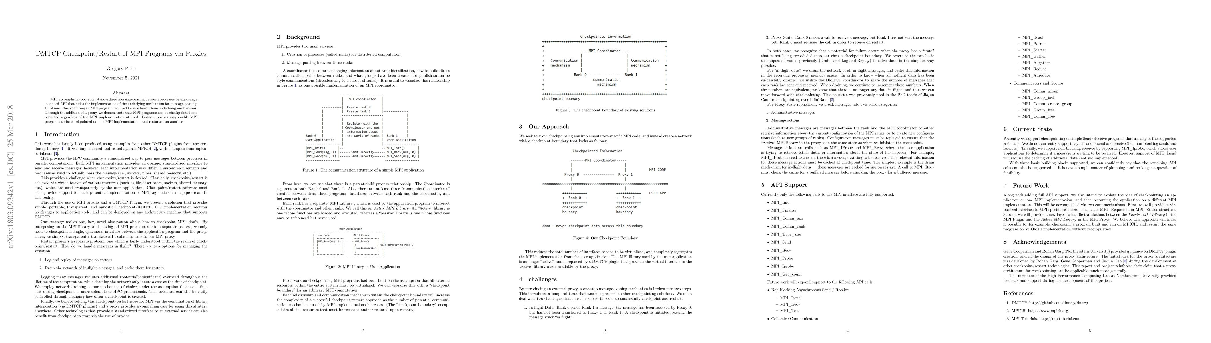 This paper introduces a method for checkpointing and restarting MPI programs using proxies, enabling portability across different MPI implementations without requiring knowledge of underlying message-passing mechanisms. The use of proxies allows for checkpointing on one MPI implementation and restarting on another.