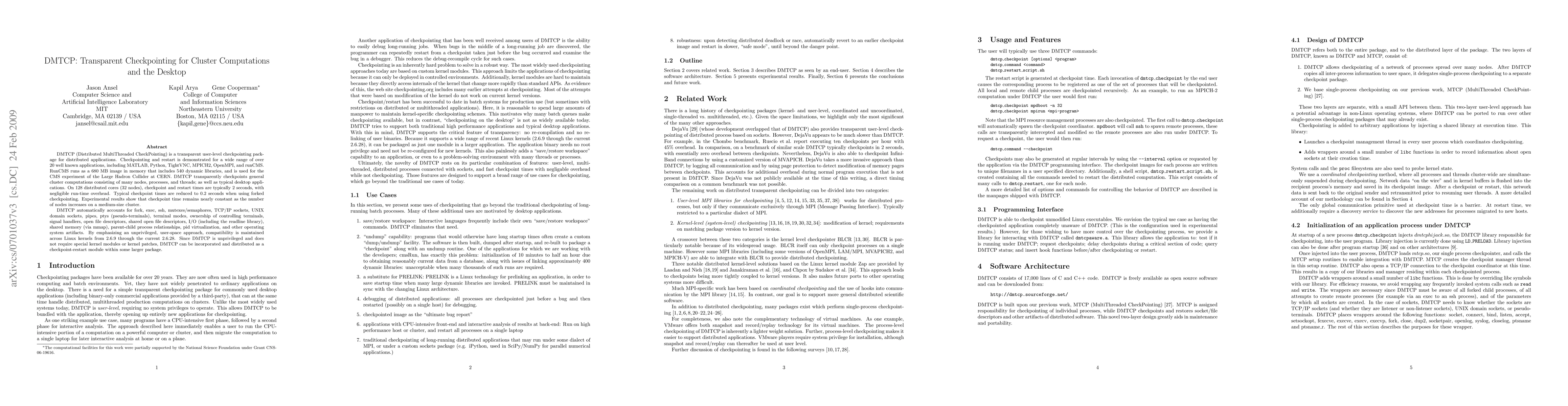 DMTCP, a transparent user-level checkpointing package, efficiently checks and restarts general cluster computations and desktop applications with minimal overhead, enabling seamless distributed computing.