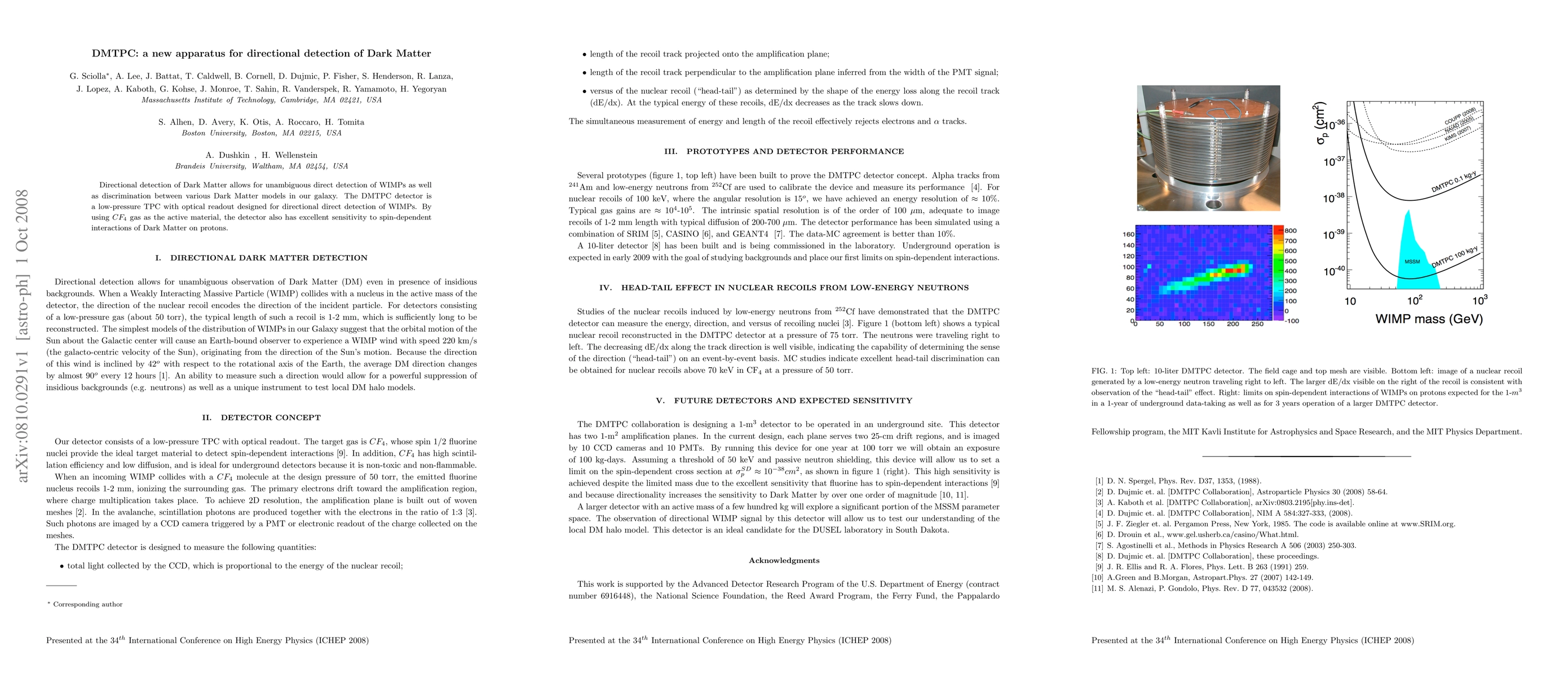 The DMTPC detector employs a low-pressure TPC with optical readout for directional detection of WIMPs, utilizing CF4 gas to enhance sensitivity to spin-dependent interactions, aiming to distinguish between various Dark Matter models.