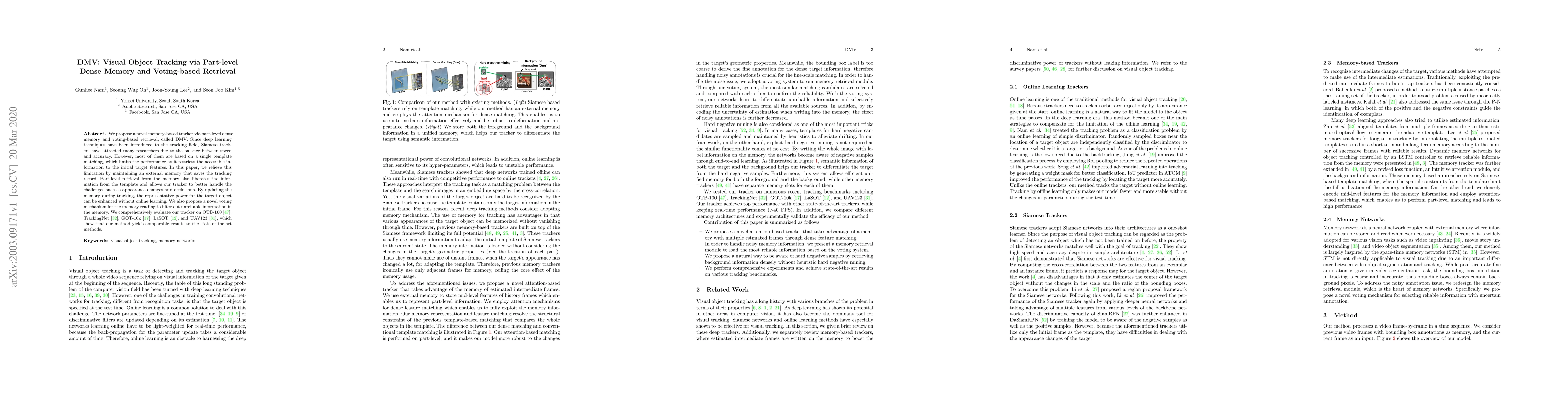 We propose a novel memory-based tracker via part-level dense memory and voting-based retrieval, called DMV. Since deep learning techniques have been introduced to the tracking field, Siamese trackers have attracted many researchers due to the balance between speed and accuracy. However, most of them are based on a single template matching, which limits the performance as it restricts the accessible in-formation to the initial target features. In this paper, we relieve this limitation by maintaining an external memory that saves the tracking record. Part-level retrieval from the memory also liberates the information from the template and allows our tracker to better handle the challenges such as appearance changes and occlusions. By updating the memory during tracking, the representative power for the target object can be enhanced without online learning. We also propose a novel voting mechanism for the memory reading to filter out unreliable information in the memory. We comprehensively evaluate our tracker on OTB-100,TrackingNet, GOT-10k, LaSOT, and UAV123, which show that our method yields comparable results to the state-of-the-art methods.