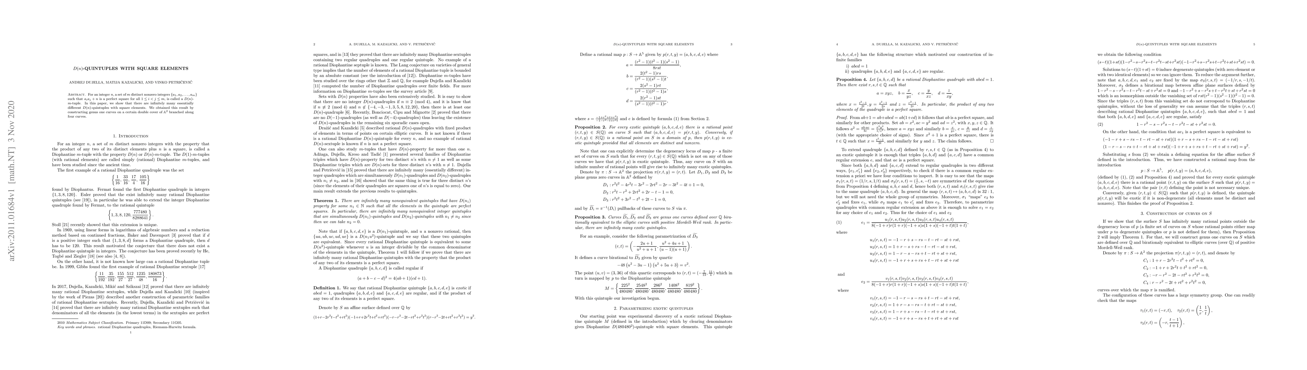 This paper demonstrates the existence of infinitely many distinct D(n)-quintuples where each element is a perfect square, achieved through the construction of genus one curves on a specific double cover of A^2 branched along four curves.