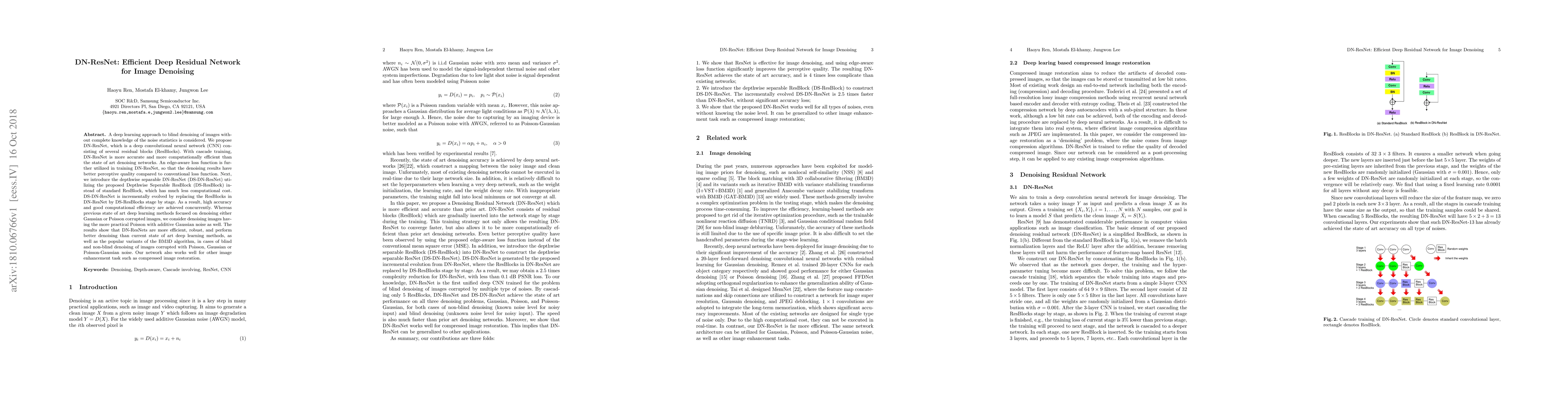 This paper introduces DN-ResNet, a deep learning model for efficient image denoising that outperforms existing methods in accuracy and computational efficiency. The model is further optimized to achieve good results on compressed image restoration tasks.