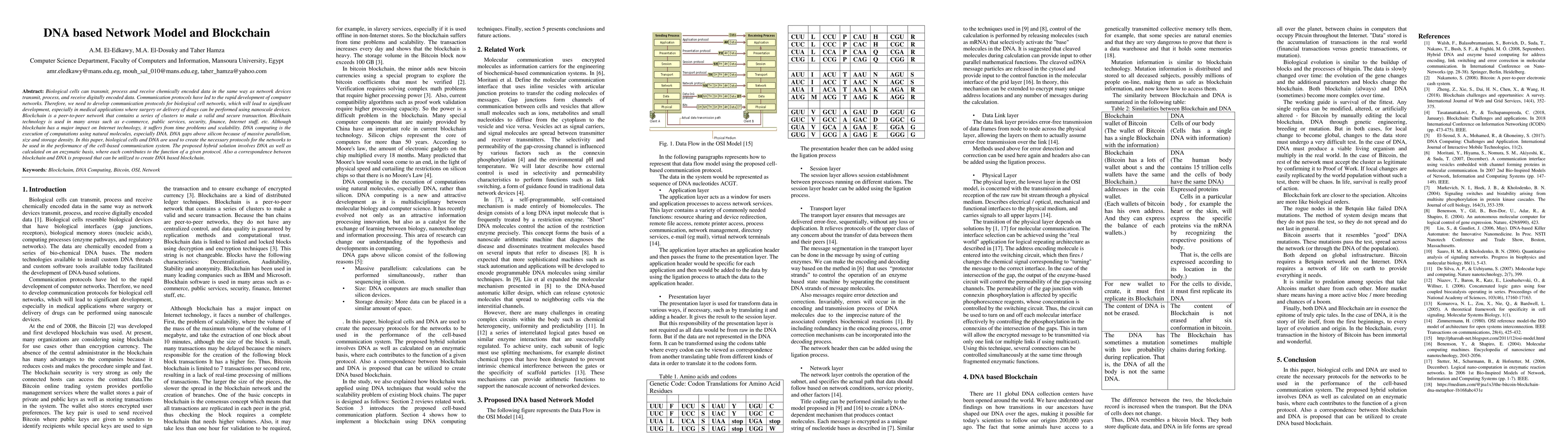 Biological cells can transmit, process and receive chemically encoded data in the same way as network devices transmit, process, and receive digitally encoded data. Communication protocols have led to the rapid development of computer networks. Therefore, we need to develop communication protocols for biological cell networks, which will lead to significant development, especially in medical applications where surgery or delivery of drugs can be performed using nanoscale devices. Blockchain is a peer-to-peer network that contains a series of clusters to make a valid and secure transaction. Blockhain technology is used in many areas such as e-commerce, public services, security, finance, Internet stuff, etc. Although blockchain has a major impact on Internet technology, it suffers from time problems and scalability. DNA computing is the execution of computations using natural molecules, especially DNA. DNA gaps above silicon because of massive parallelism, size and storage density. In this paper, biological cells and DNA are used to create the necessary protocols for the networks to be used in the performance of the cell-based communication system. The proposed hybrid solution involves DNA as well as calculated on an enzymatic basis, where each contributes to the function of a given protocol. Also a correspondence between blockchain and DNA is proposed that can be utilized to create DNA based blockchain.