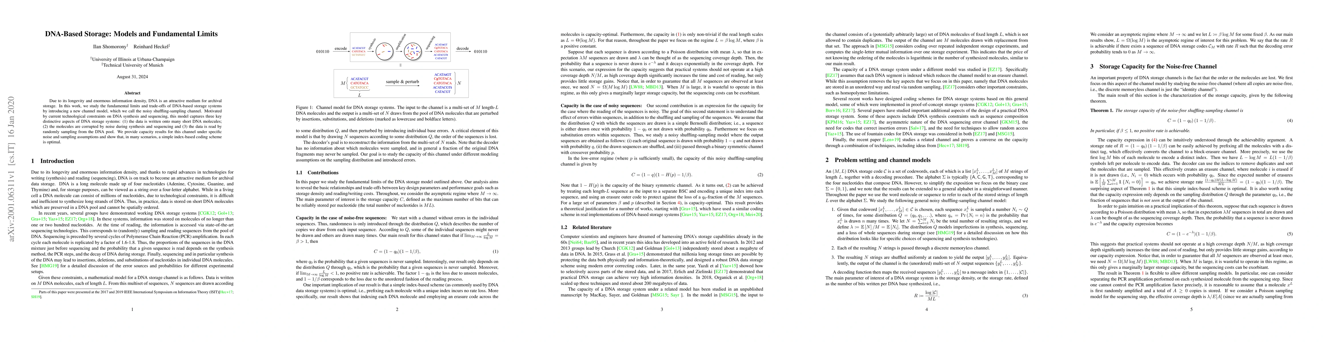 Due to its longevity and enormous information density, DNA is an attractive medium for archival storage. In this work, we study the fundamental limits and trade-offs of DNA-based storage systems by introducing a new channel model, which we call the noisy shuffling-sampling channel. Motivated by current technological constraints on DNA synthesis and sequencing, this model captures three key distinctive aspects of DNA storage systems: (1) the data is written onto many short DNA molecules; (2) the molecules are corrupted by noise during synthesis and sequencing and (3) the data is read by randomly sampling from the DNA pool. We provide capacity results for this channel under specific noise and sampling assumptions and show that, in many scenarios, a simple index-based coding scheme is optimal.