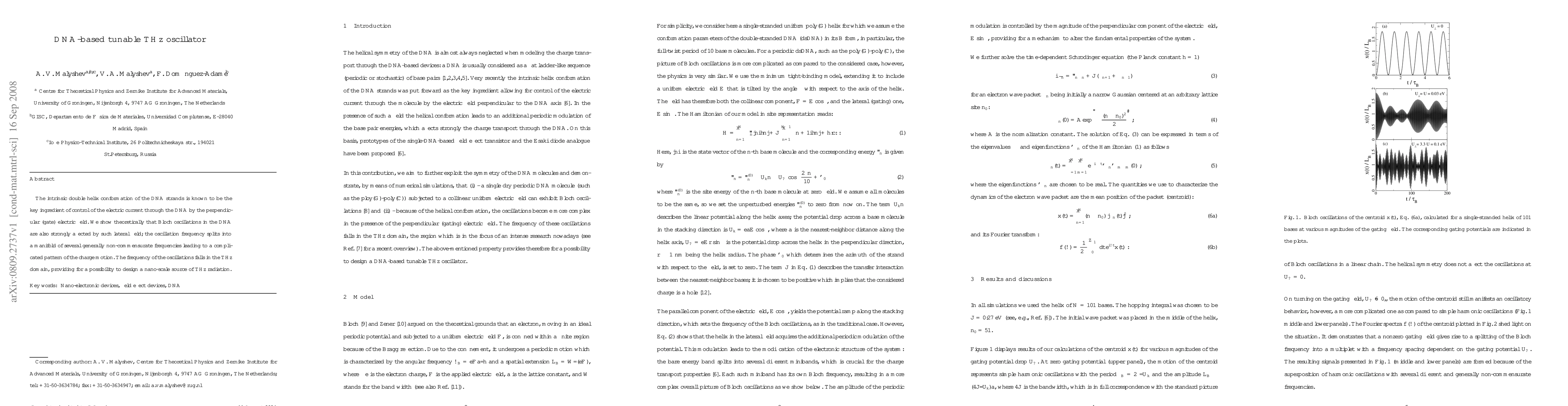The intrinsic double helix conformation of the DNA strands is known to be the key ingredient of control of the electric current through the DNA by the perpendicular (gate) electric field. We show theoretically that Bloch oscillations in the DNA are also strongly affected by such lateral field; the oscillation frequency splits into a manifold of several generally non-commensurate frequencies leading to a complicated pattern of the charge motion. The frequency of the oscillations falls in the THz domain, providing for a possibility to design a nano-scale source of THz radiation.