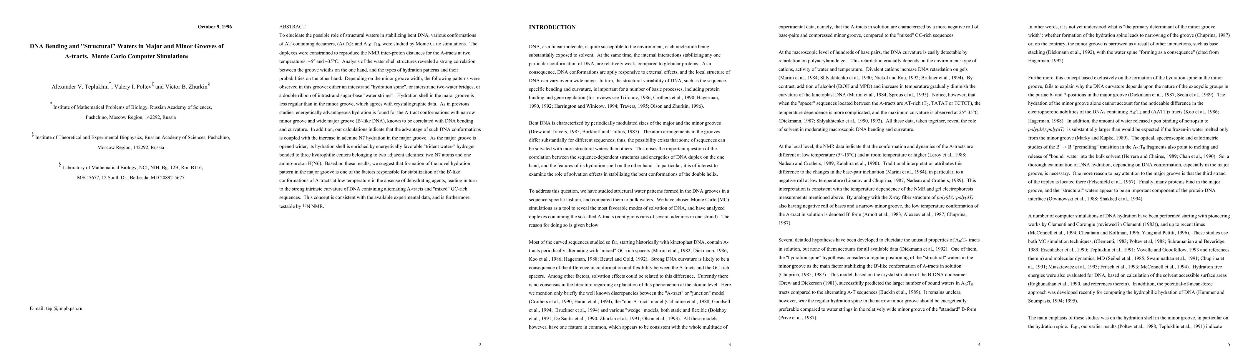 To elucidate the possible role of structural waters in stabilizing bent DNA, various conformations of AT-containing decamers, (A5T5)2 and A10:T10, were studied by Monte Carlo simulations. The duplexes were constrained to reproduce the NMR inter-proton distances for the A-tracts at two temperatures: 5 and 35C. Analysis of the water shell structures revealed a strong correlation between the groove widths on the one hand, and the types of hydration patterns and their probabilities on the other hand. Depending on the minor groove width, the following patterns were observed in this groove: either an interstrand "hydration spine", or interstrand two-water bridges, or a double ribbon of intrastrand sugar-base "water strings". Hydration shell in the major groove is less regular than in the minor groove, which agrees with crystallographic data. As in previous studies, energetically advantageous hydration is found for the A-tract conformations with narrow minor groove and wide major groove (B'-like DNA), known to be correlated with DNA bending and curvature. In addition, our calculations indicate that the advantage of such DNA conformations is coupled with the increase in adenine N7 hydration in the major groove. As the major groove is opened wider, its hydration shell is enriched by energetically favorable "trident waters" hydrogen bonded to three hydrophilic centers belonging to two adjacent adenines: two N7 atoms and one amino-proton H(N6). Based on these results, we suggest that formation of the novel hydration pattern in the major groove is one of the factors responsible for stabilization of the B'-like conformations of A-tracts at low temperature in the absense of dehydrating agents, leading in turn to the strong intrinsic curvature of DNA containing alternating A-tracts and "mixed" GC-rich sequences.