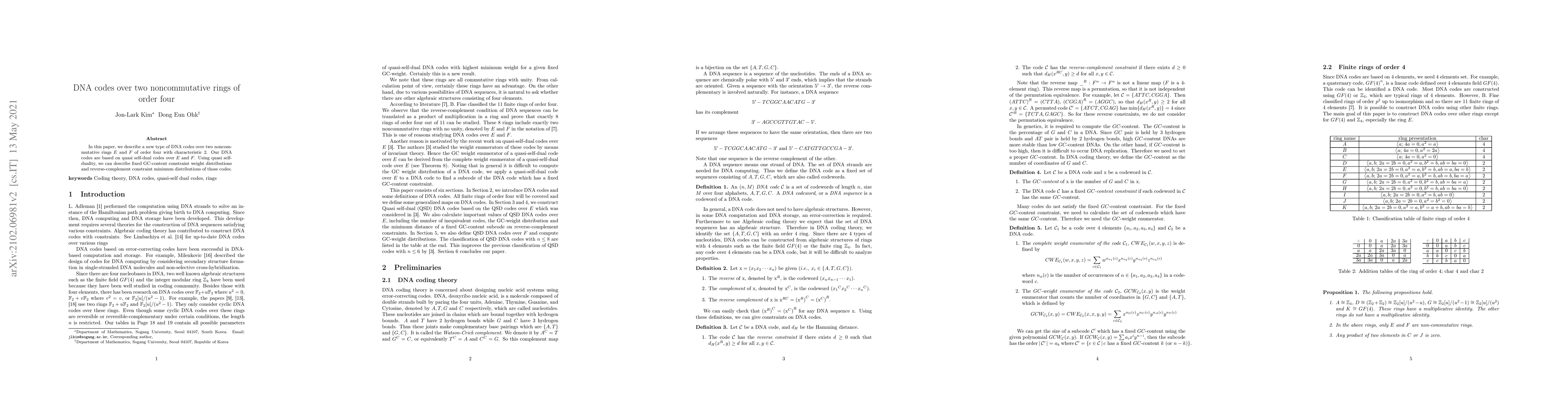 In this paper, we describe a new type of DNA codes over two noncommutative rings $E$ and $F$ of order four with characteristic 2. Our DNA codes are based on quasi self-dual codes over $E$ and $F$. Using quasi self-duality, we can describe fixed GC-content constraint weight distributions and reverse-complement constraint minimum distributions of those codes.