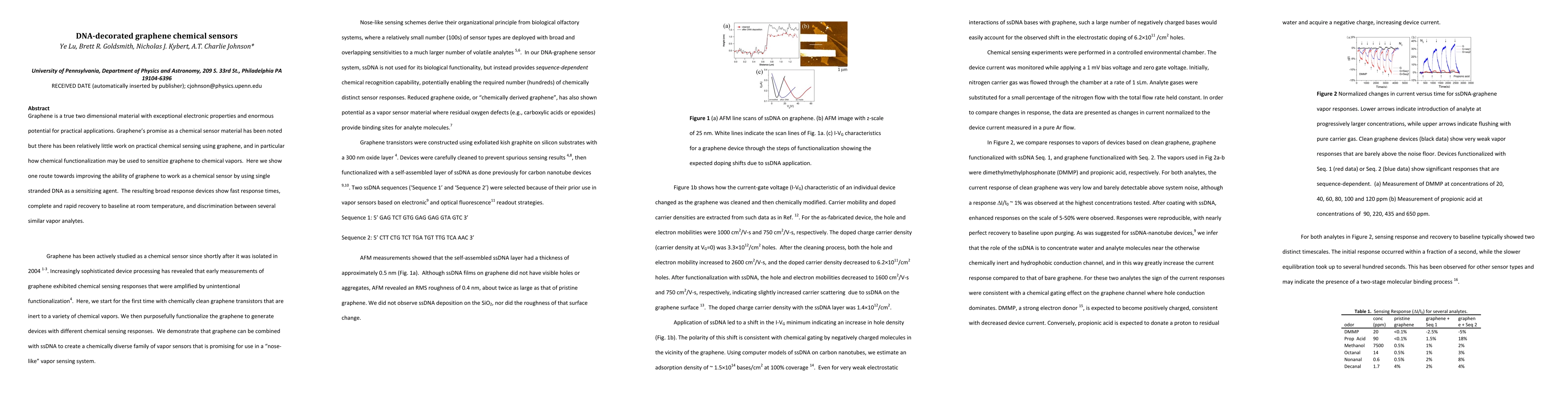 This paper explores the use of single-stranded DNA to functionalize graphene, enhancing its sensitivity as a chemical sensor. The DNA-decorated graphene sensors exhibit rapid response times, quick recovery, and the ability to distinguish between similar vapor analytes.