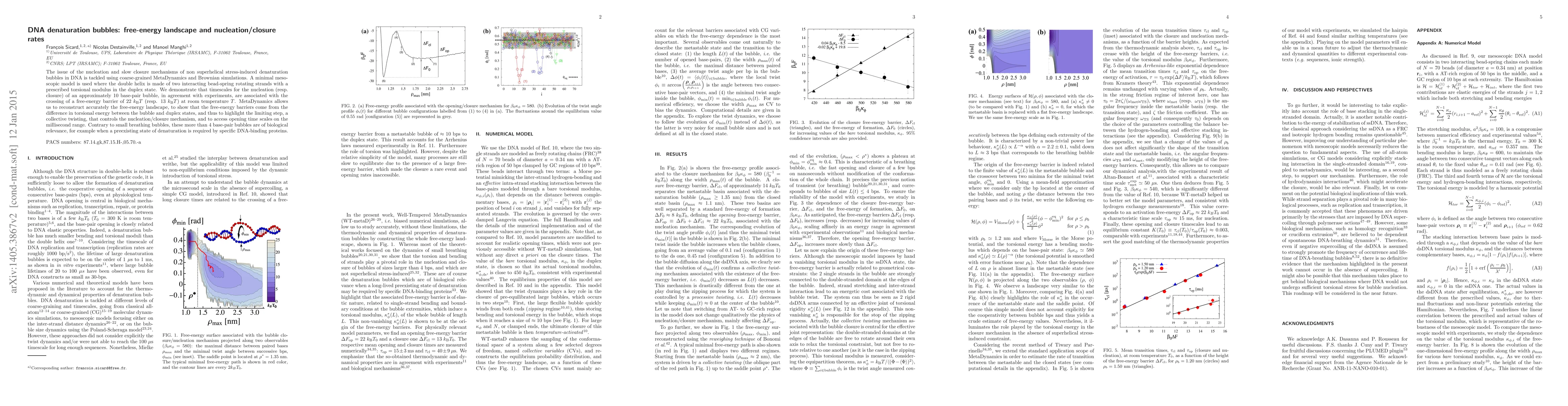 The issue of the nucleation and slow closure mechanisms of non superhelical stress-induced denaturation bubbles in DNA is tackled using coarse-grained MetaDynamics and Brownian simulations. A minimal mesoscopic model is used where the double helix is made of two interacting bead-spring rotating strands with a prescribed torsional modulus in the duplex state. We demonstrate that timescales for the nucleation (resp. closure) of an approximately 10 base-pair bubble, in agreement with experiments, are associated with the crossing of a free-energy barrier of $22~k_{\rm B}T$ (resp. $13~k_{\rm B}T$) at room temperature $T$. MetaDynamics allows us to reconstruct accurately the free-energy landscape, to show that the free-energy barriers come from the difference in torsional energy between the bubble and duplex states, and thus to highlight the limiting step, a collective twisting, that controls the nucleation/closure mechanism, and to access opening time scales on the millisecond range. Contrary to small breathing bubbles, these more than 4~base-pair bubbles are of biological relevance, for example when a preexisting state of denaturation is required by specific DNA-binding proteins.