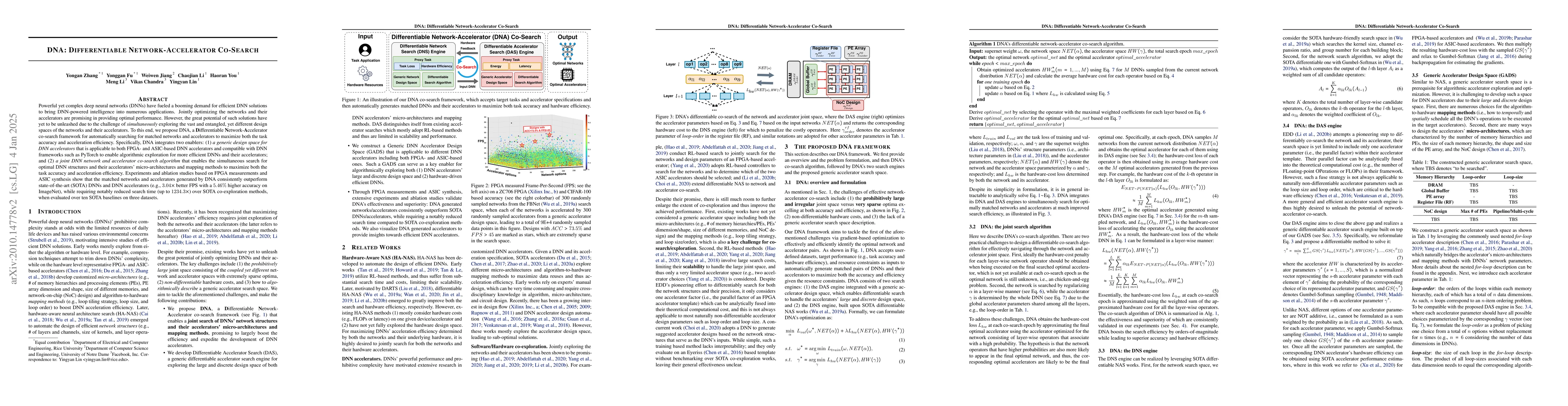 The paper proposes DNA, a Differentiable Network-Accelerator co-search framework that jointly optimizes deep neural networks and their accelerators to maximize task accuracy and efficiency. DNA integrates a generic accelerator design space and a joint search algorithm to outperform state-of-the-art methods, achieving up to 3.04x better FPS with higher accuracy and significantly reduced search time.