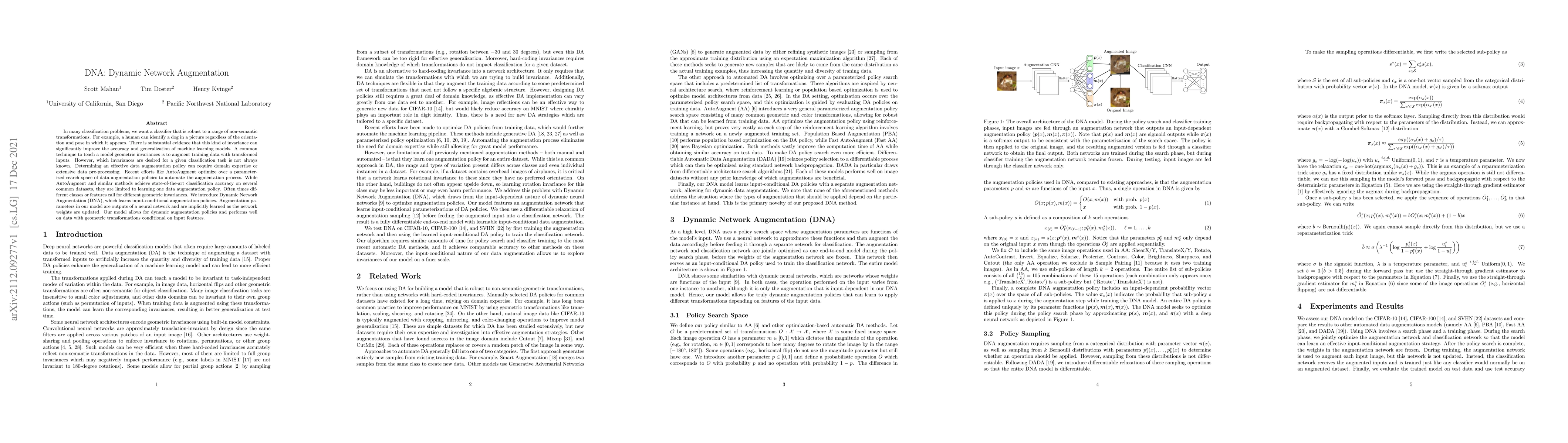 In many classification problems, we want a classifier that is robust to a range of non-semantic transformations. For example, a human can identify a dog in a picture regardless of the orientation and pose in which it appears. There is substantial evidence that this kind of invariance can significantly improve the accuracy and generalization of machine learning models. A common technique to teach a model geometric invariances is to augment training data with transformed inputs. However, which invariances are desired for a given classification task is not always known. Determining an effective data augmentation policy can require domain expertise or extensive data pre-processing. Recent efforts like AutoAugment optimize over a parameterized search space of data augmentation policies to automate the augmentation process. While AutoAugment and similar methods achieve state-of-the-art classification accuracy on several common datasets, they are limited to learning one data augmentation policy. Often times different classes or features call for different geometric invariances. We introduce Dynamic Network Augmentation (DNA), which learns input-conditional augmentation policies. Augmentation parameters in our model are outputs of a neural network and are implicitly learned as the network weights are updated. Our model allows for dynamic augmentation policies and performs well on data with geometric transformations conditional on input features.