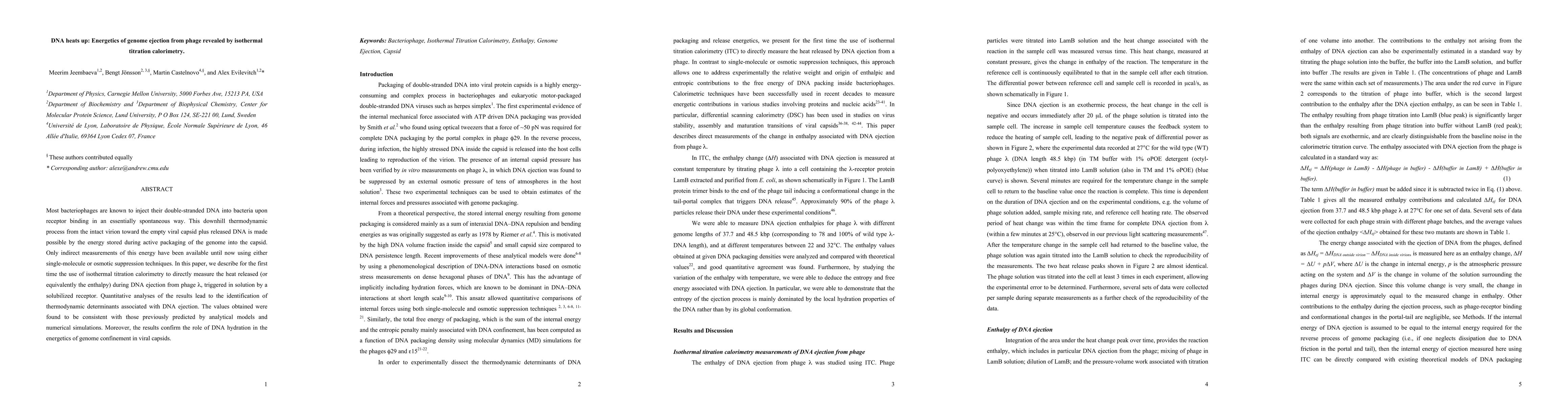 This paper uses isothermal titration calorimetry to directly measure the enthalpy changes during DNA ejection from phage lambda, revealing thermodynamic determinants and confirming the role of DNA hydration in genome confinement. The findings align with previous analytical models and simulations.