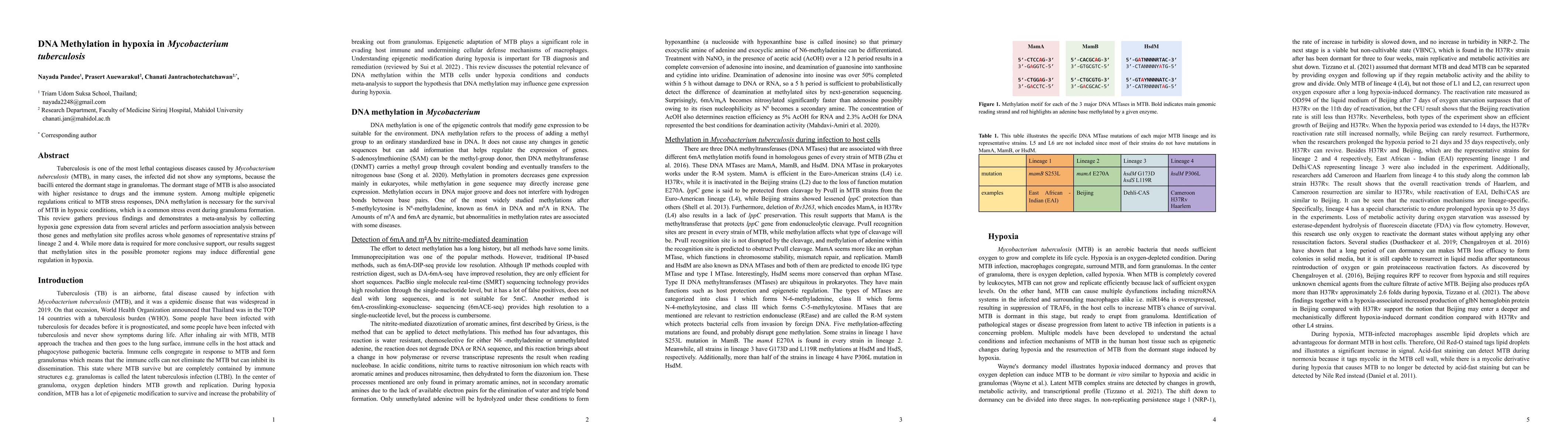 Tuberculosis is one of the most lethal contagious diseases caused by Mycobacterium tuberculosis (MTB), in many cases, the infected did not show any symptoms, because the bacilli entered the dormant stage in granulomas. The dormant stage of MTB is also associated with higher resistance to drugs and the immune system. Among multiple epigenetic regulations critical to MTB stress responses, DNA methylation is necessary for the survival of MTB in hypoxic conditions, which is a common stress event during granuloma formation. This review gathers previous findings and demonstrates a meta-analysis by collecting hypoxia gene expression data from several articles and perform association analysis between those genes and methylation site profiles across whole genomes of representative strains pf lineage 2 and 4. While more data is required for more conclusive support, our results suggest that methylation sites in the possible promoter regions may induce differential gene regulation in hypoxia.